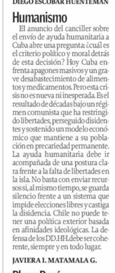 | Título: | Cartas: Humanismo El anuncio del canciller sobre el envío de ayuda humanitaria a Cuba abre una pregunta: ¿ cuál es el criterio político y moral detrás de esta decisión? Hoy Cuba enfrenta apagones masivos y un grave desabastecimiento de alimentos y medicamentos. Pero esta crisis no es nueva ni inespe |