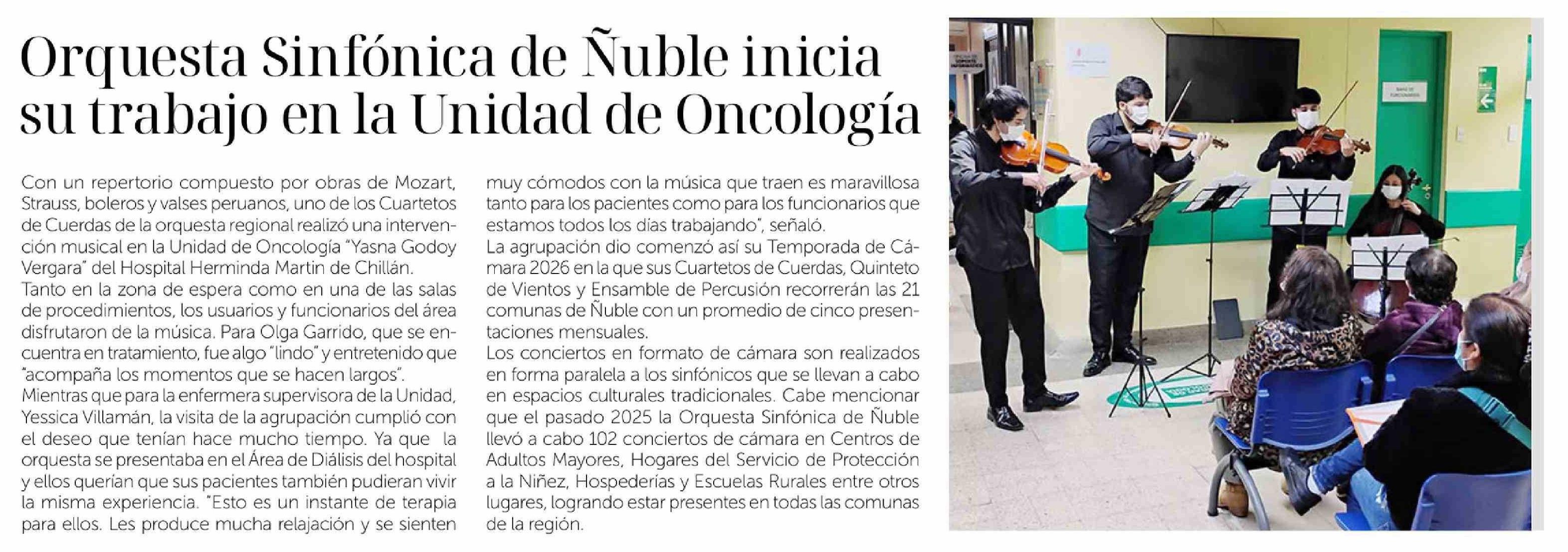 Orquesta Sinfónica de Ñuble inicia su trabajo en la Unidad de Oncología