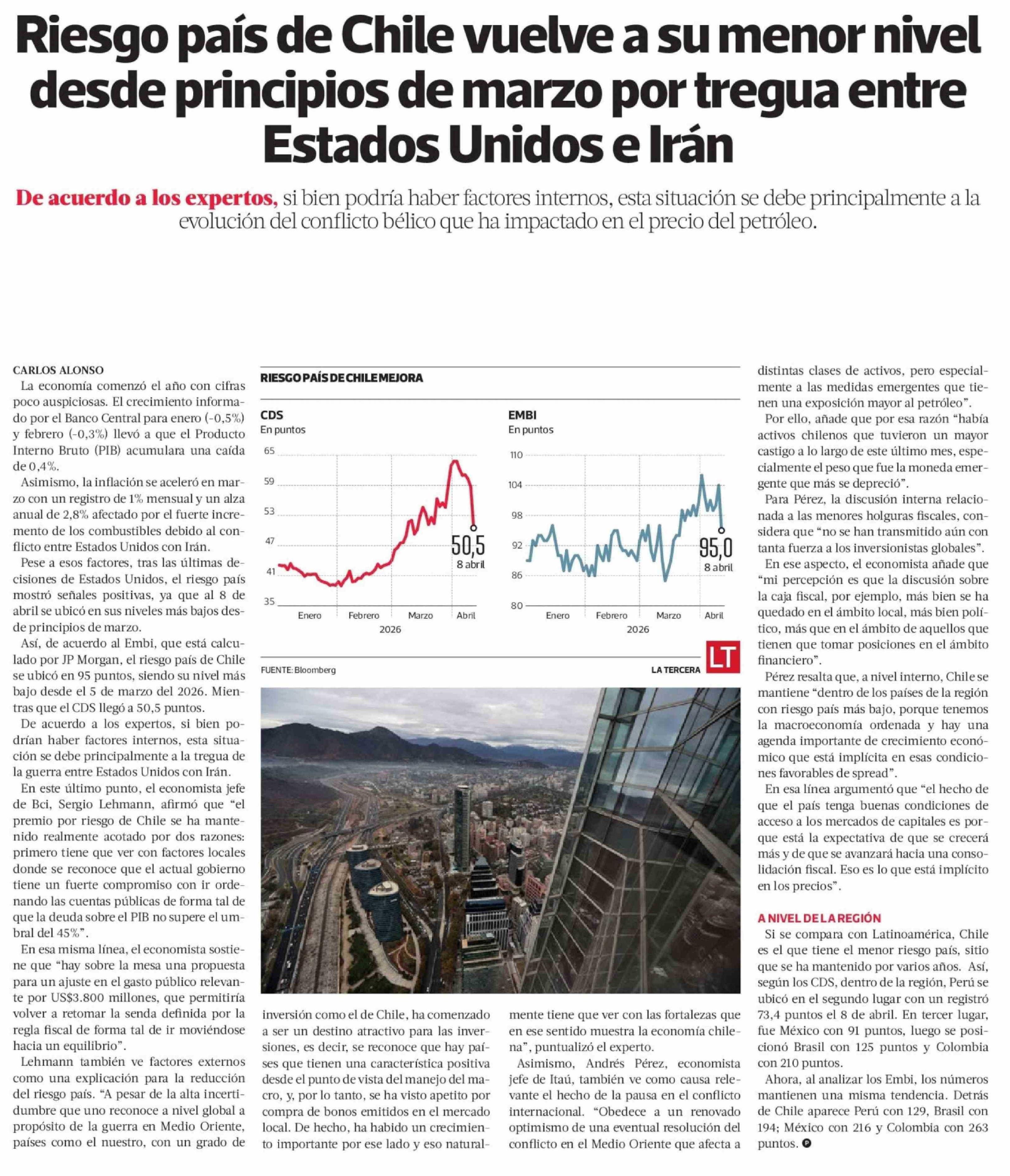 Riesgo país de Chile vuelve a su menor nivel desde principios de marzo por tregua entre Estados Unidos e Irán