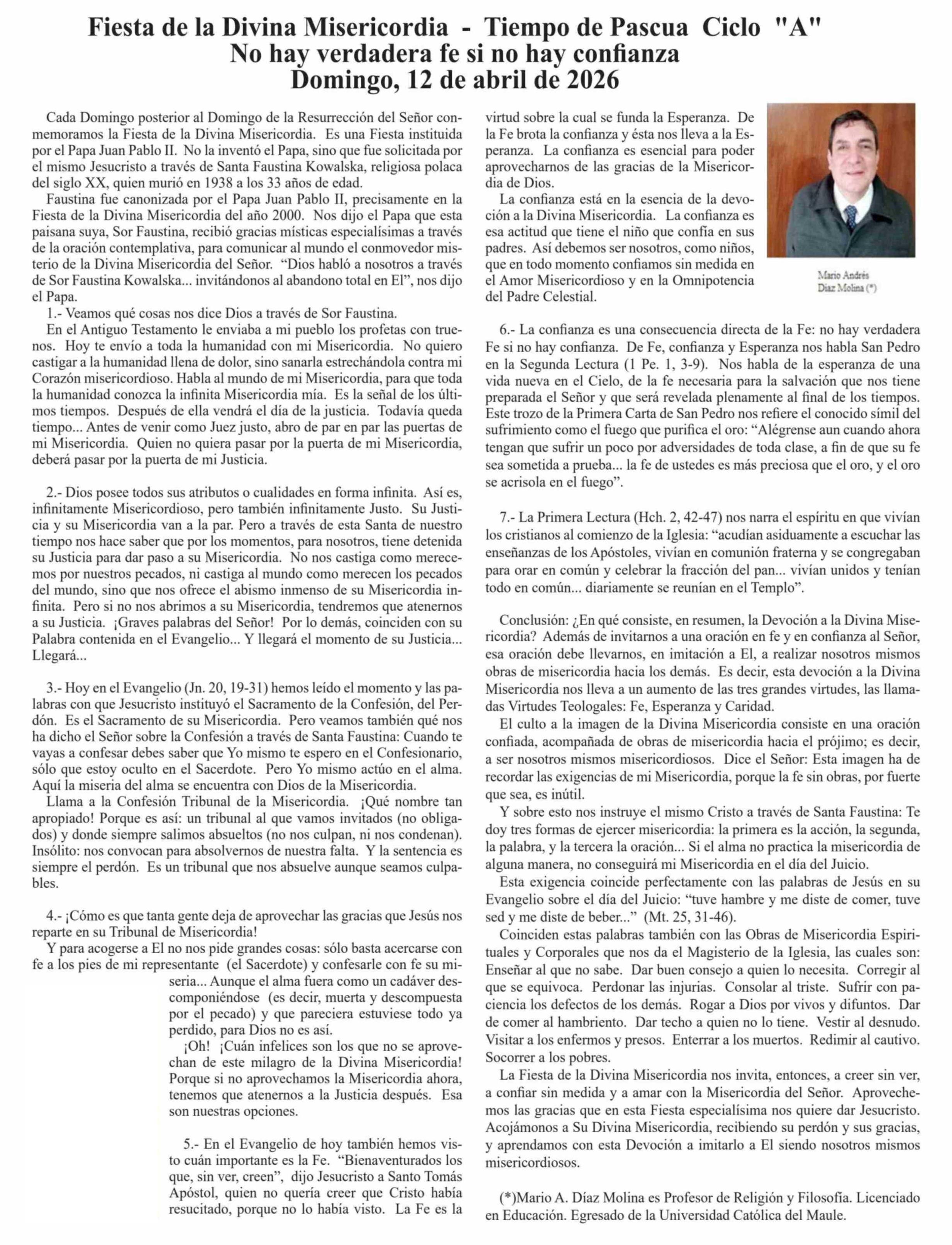 COLUMNAS DE OPINIÓN: Fiesta de la Divina Misericordia - Tiempo de Pascua Ciclo "A" No hay verdadera fe si no hay confianza Domingo, 12 de abril de 2026