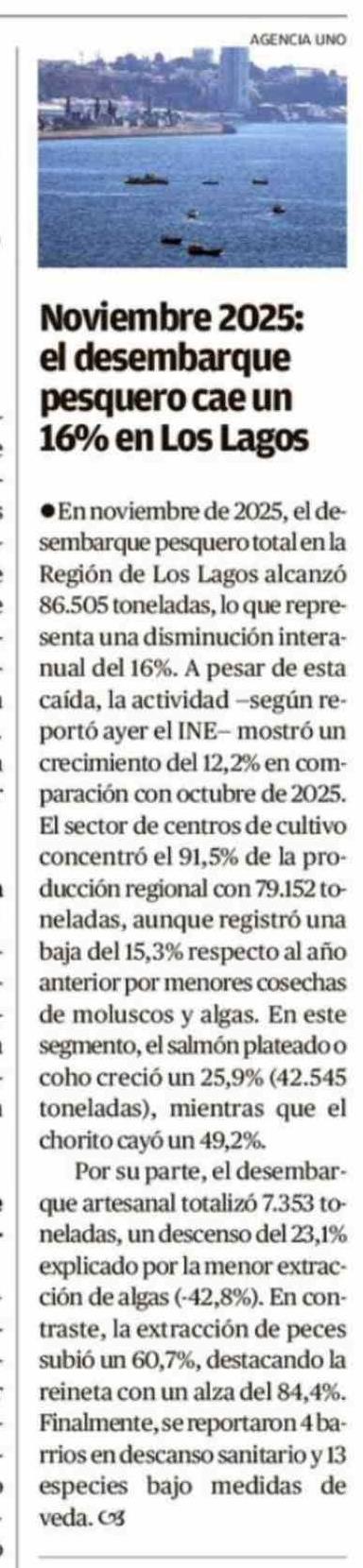 Noviembre 2025: el desembarque pesquero cae un 16% en Los Lagos