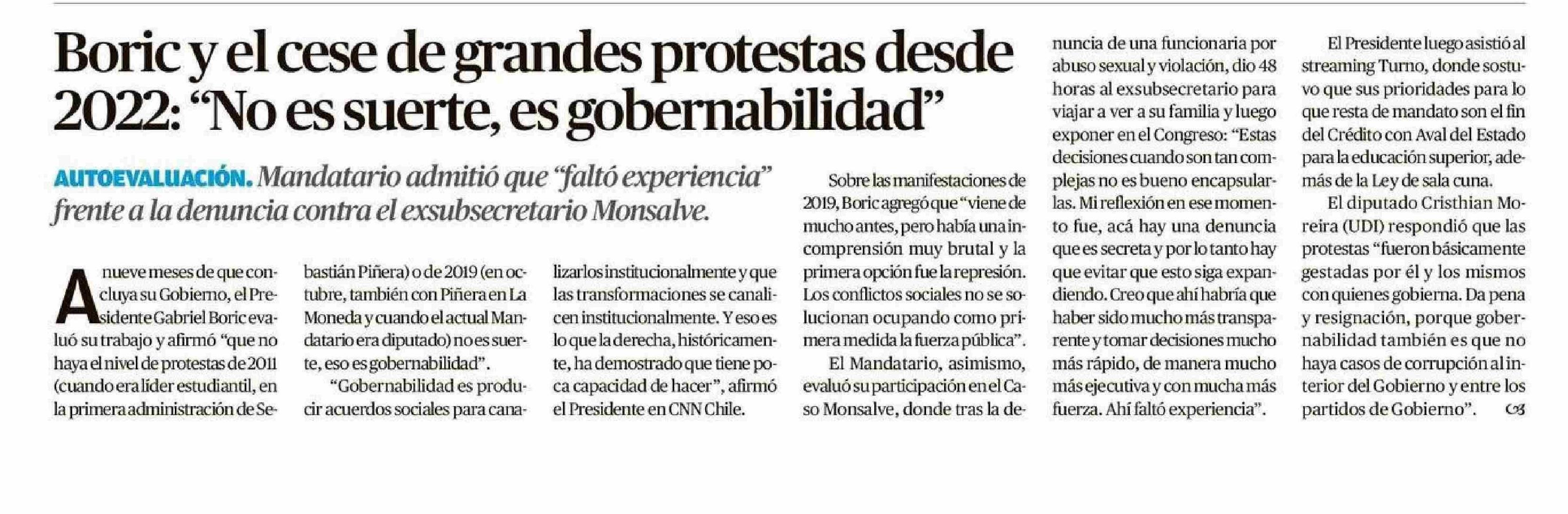 Boric y el cese de grandes protestas desde 2022: “No es suerte, es gobernabilidad”