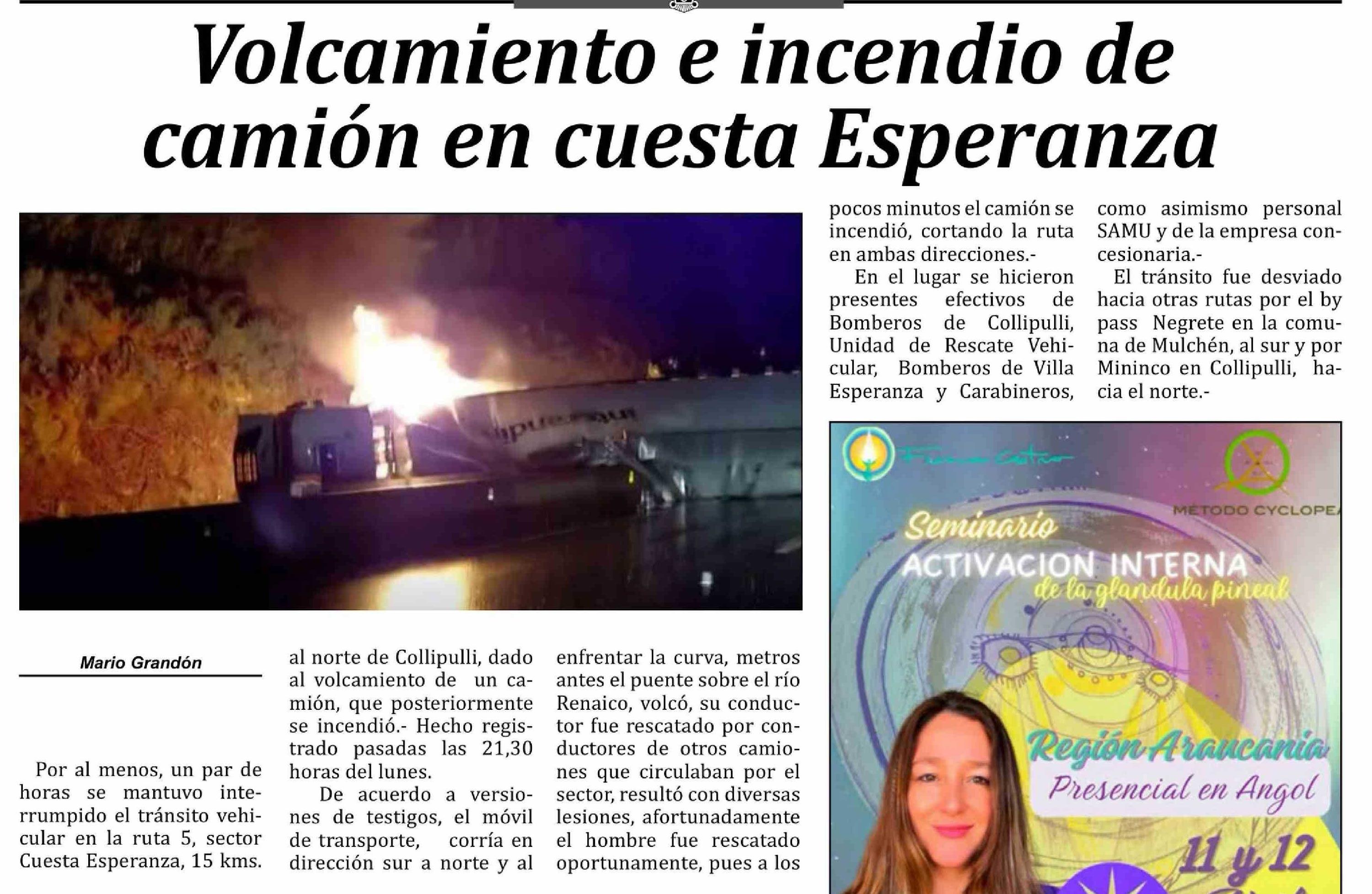 Volcamiento e incendio de camión en cuesta Esperanza