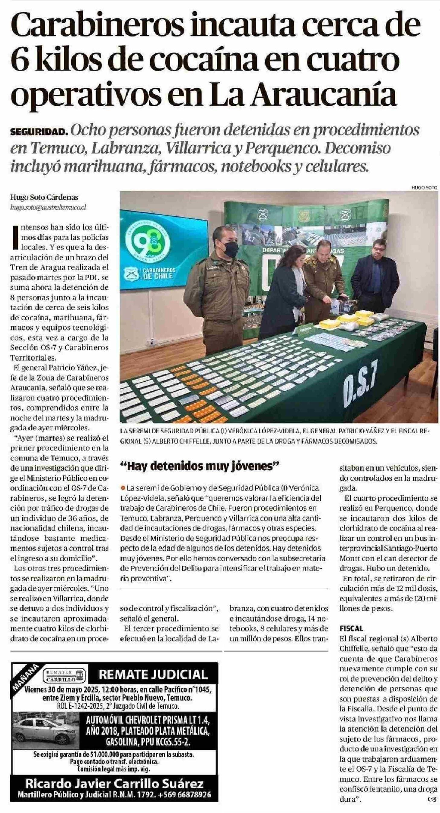 Carabineros incauta cerca de 6 kilos de cocaína en cuatro operativos en La Araucanía