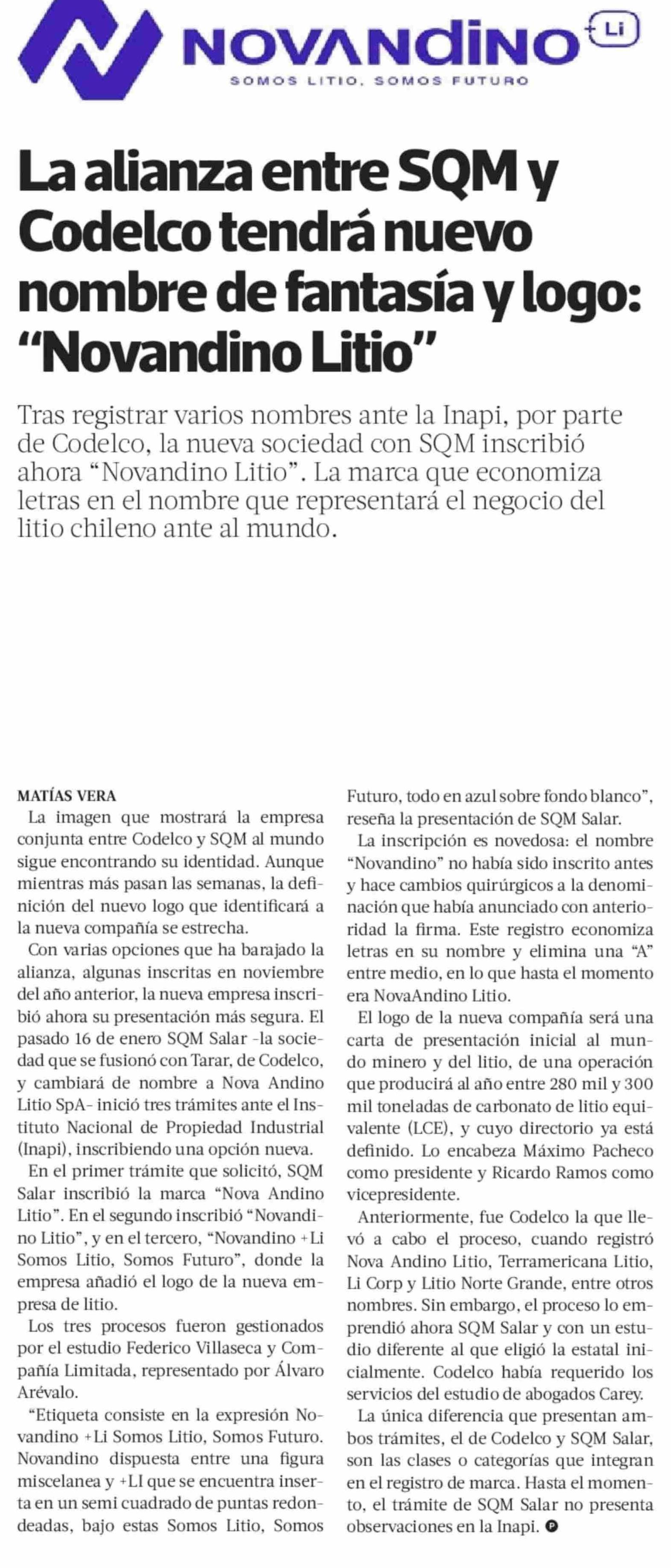 La alianza entre SQM y Codelco tendrá nuevo nombre de fantasía y logo: "Novandino Litio"