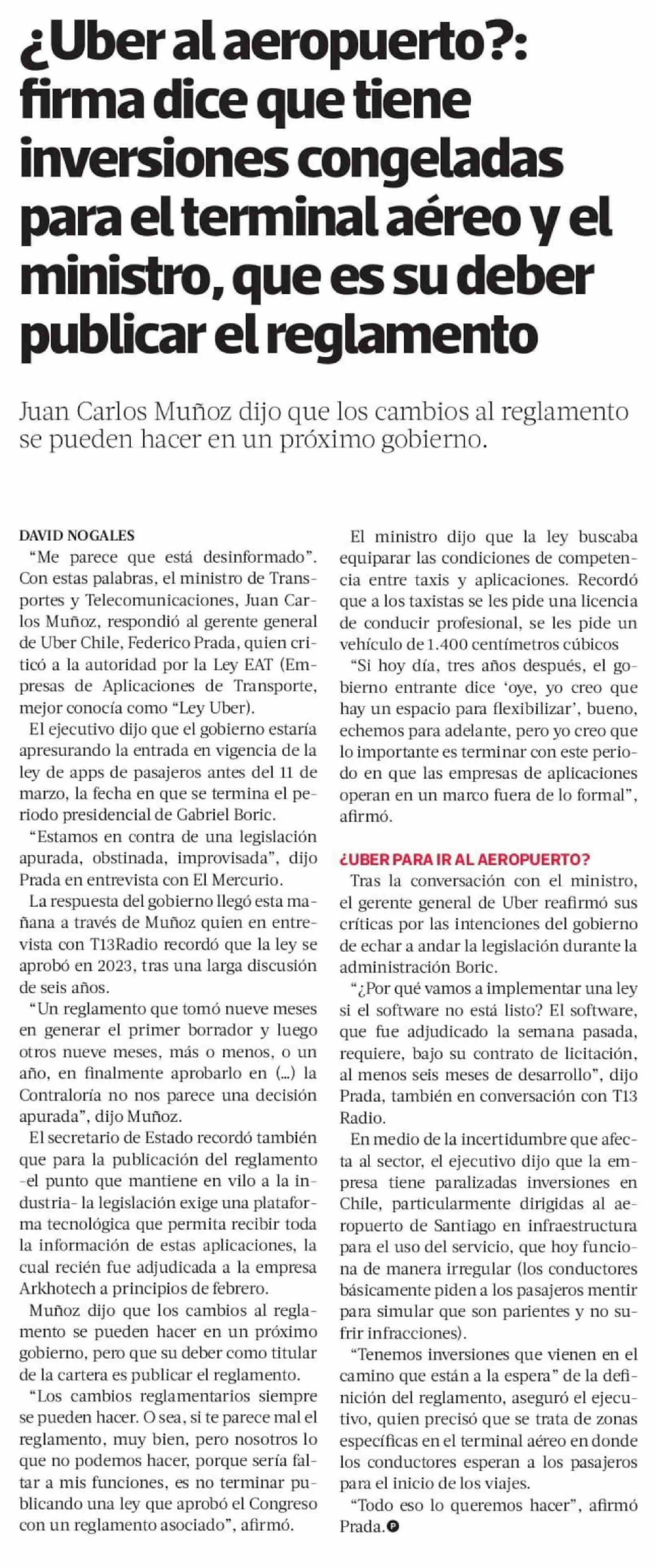 | Título: | ¿Uber al aeropuerto ?: firma dice que tiene inversiones congeladas para el terminal aéreo y el ministro, que es su deber publicar el reglamento |