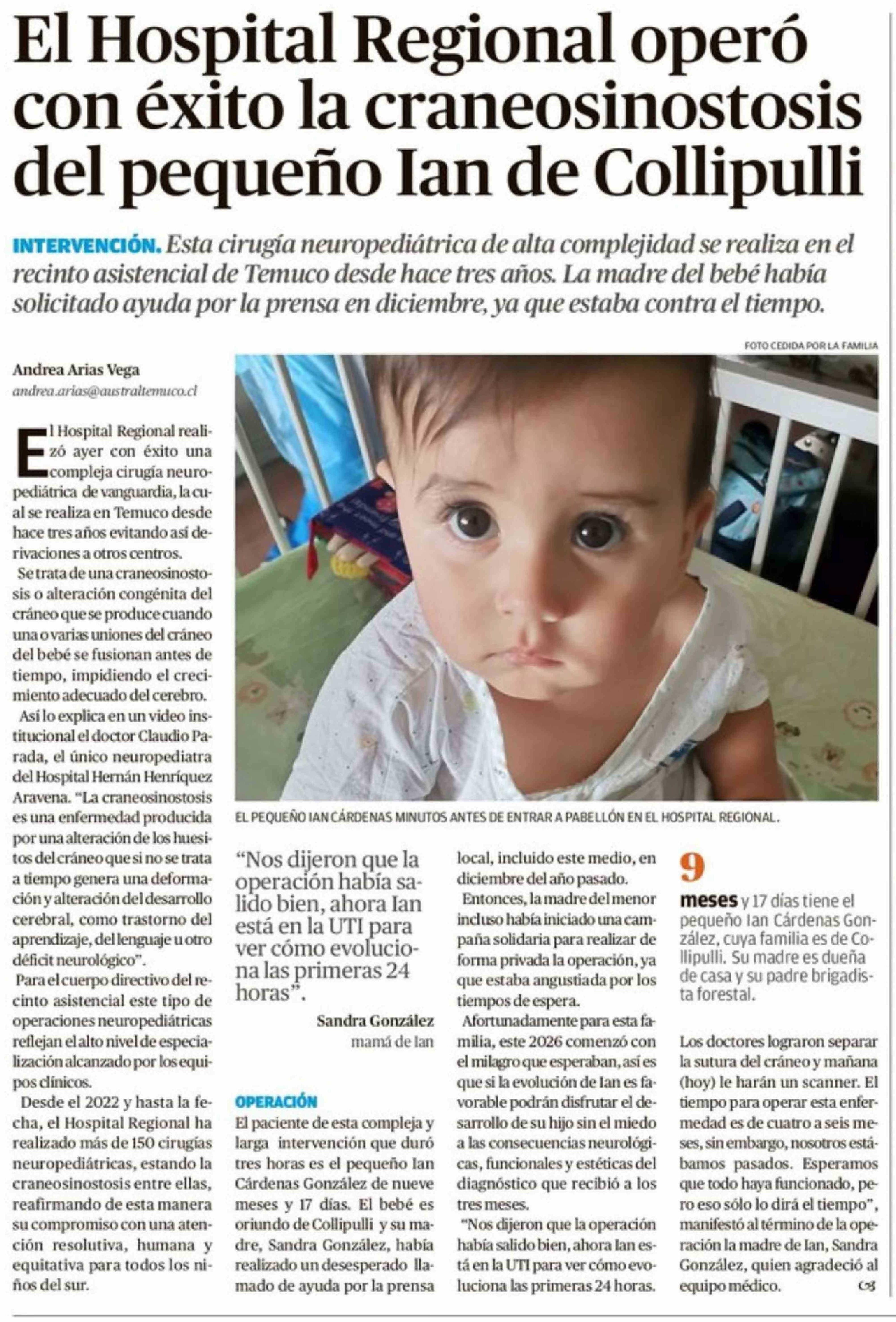 El Hospital Regional operó con éxito la craneosinostosis del pequeño Ian de Collipulli
