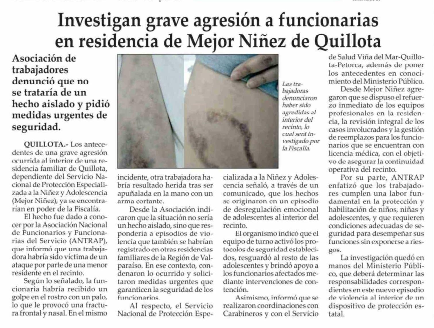 Investigan grave agresión a funcionarias en residencia de Mejor Niñez de Quillota