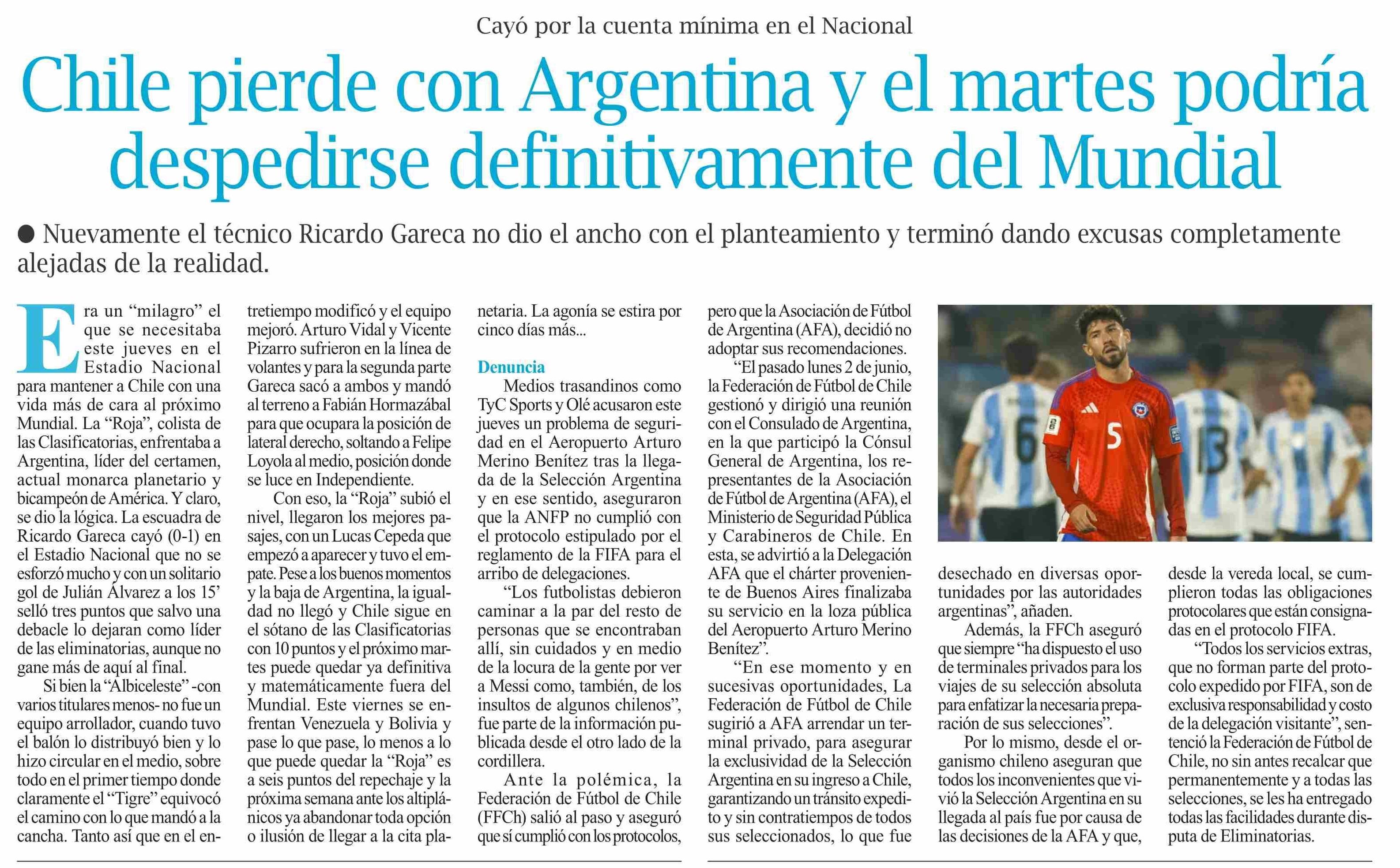 Chile pierde con Argentina y el martes podría despedirse definitivamente del Mundial
