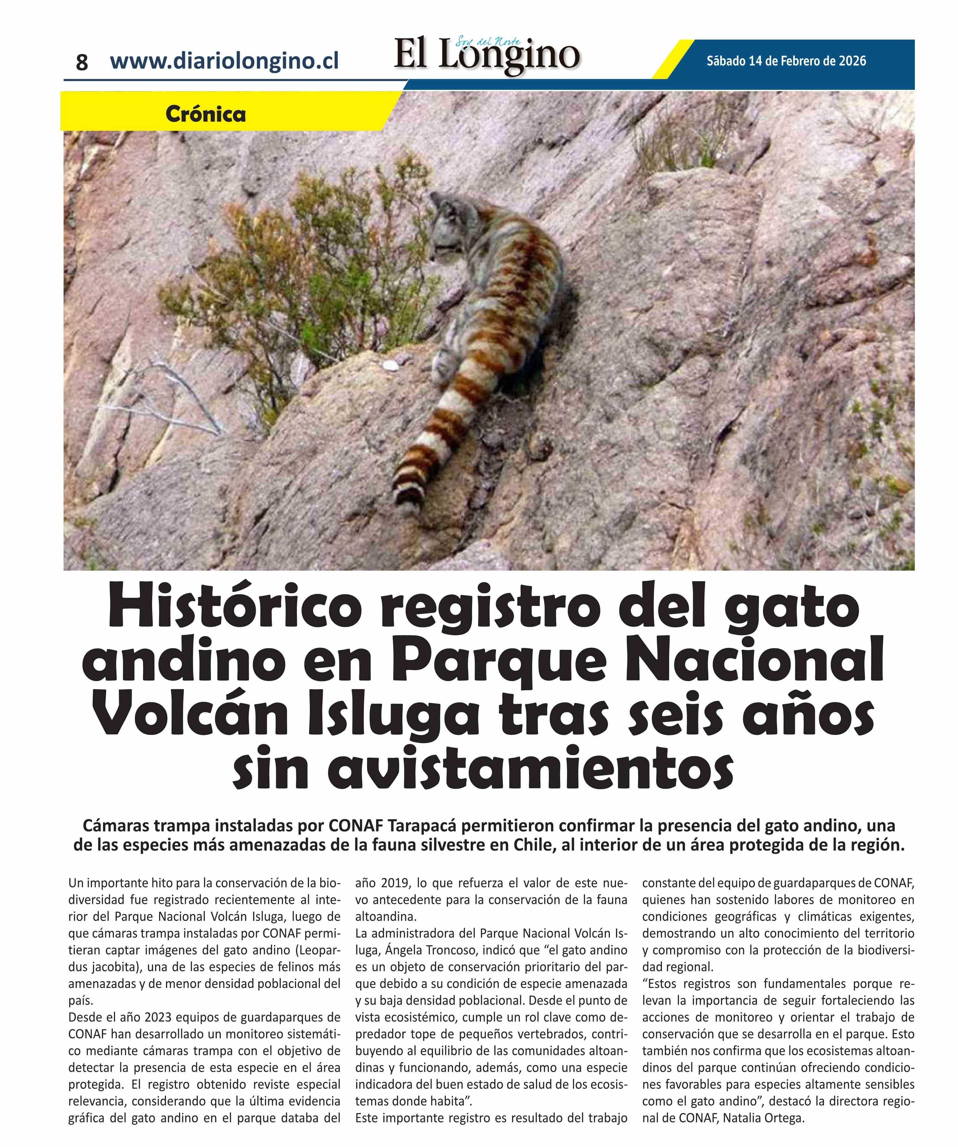 Histórico registro del gato andino en Parque Nacional Volcán Isluga tras seis años sin avistamientos
