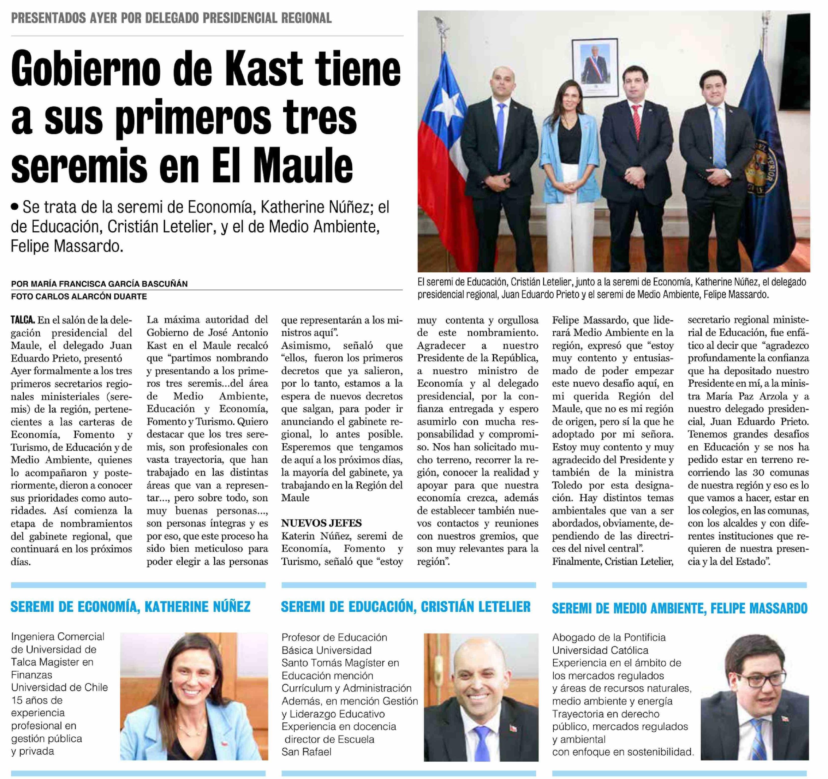 Gobierno de Kast tiene a sus primeros tres seremis en El Maule
