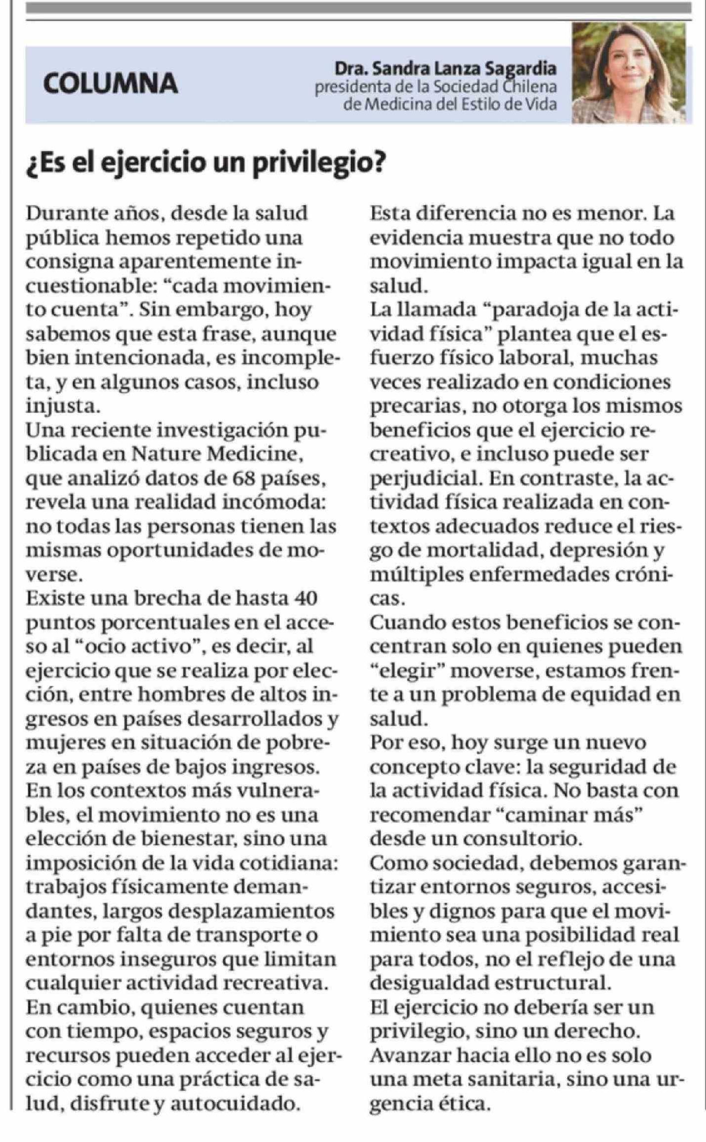 Título: Columnas de Opinión: Durante años, desde la salud pública hemos repetido una consigna aparentemente incuestionable: "cada movimiento cuenta". Sin embargo, hoy sabemos que esta frase, aunque bien intencionada, es incompleta, y en algunos casos, incluso injusta. Una reciente investigación publicada en