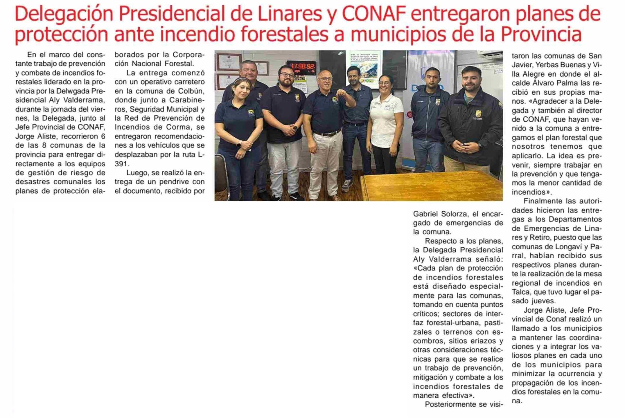 Delegación Presidencial de Linares y CONAF entregaron planes de protección ante incendio forestales a municipios de la Provincia