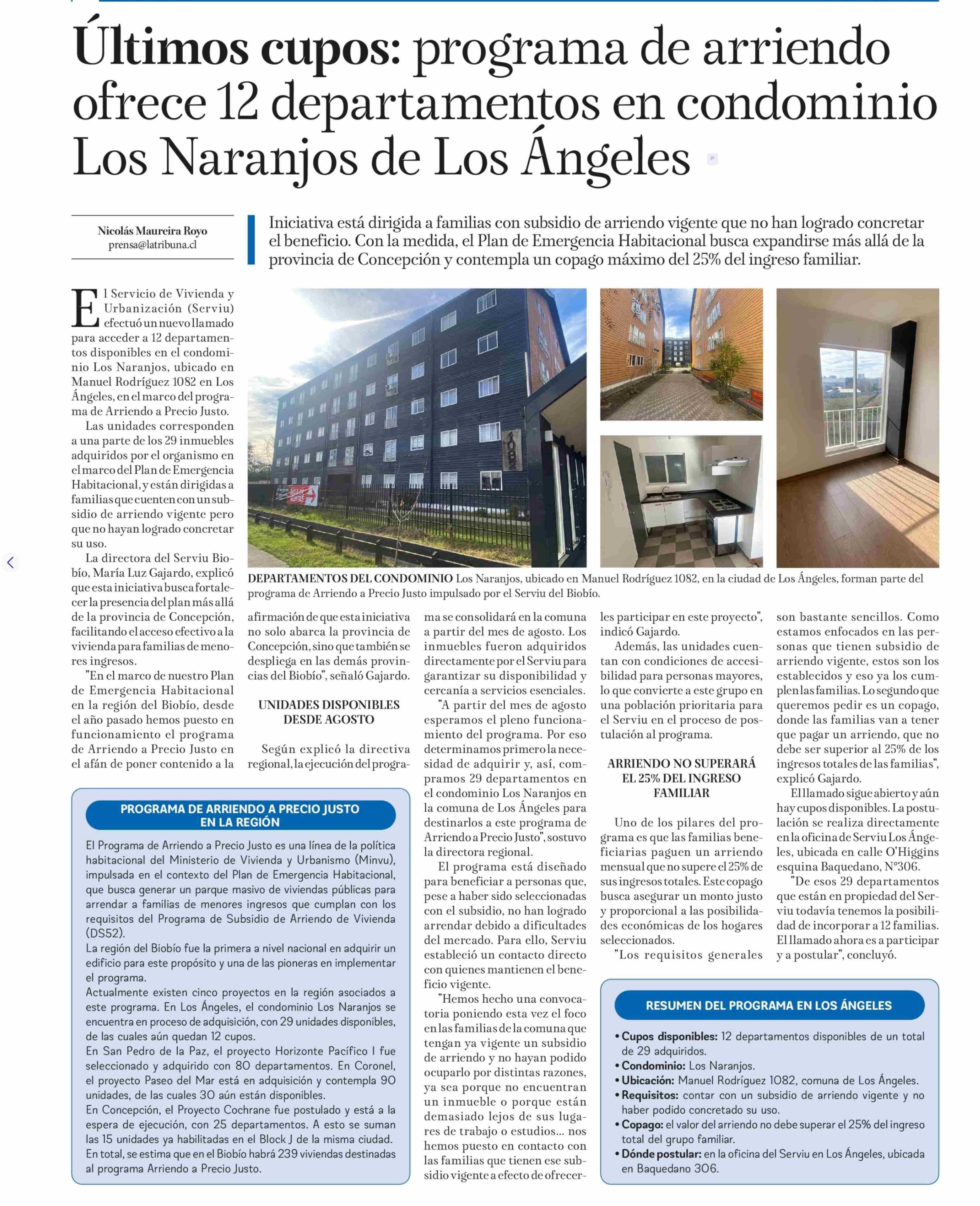 Últimos cupos: programa de arriendo ofrece 12 departamentos en condominio Los Naranjos de Los Angeles