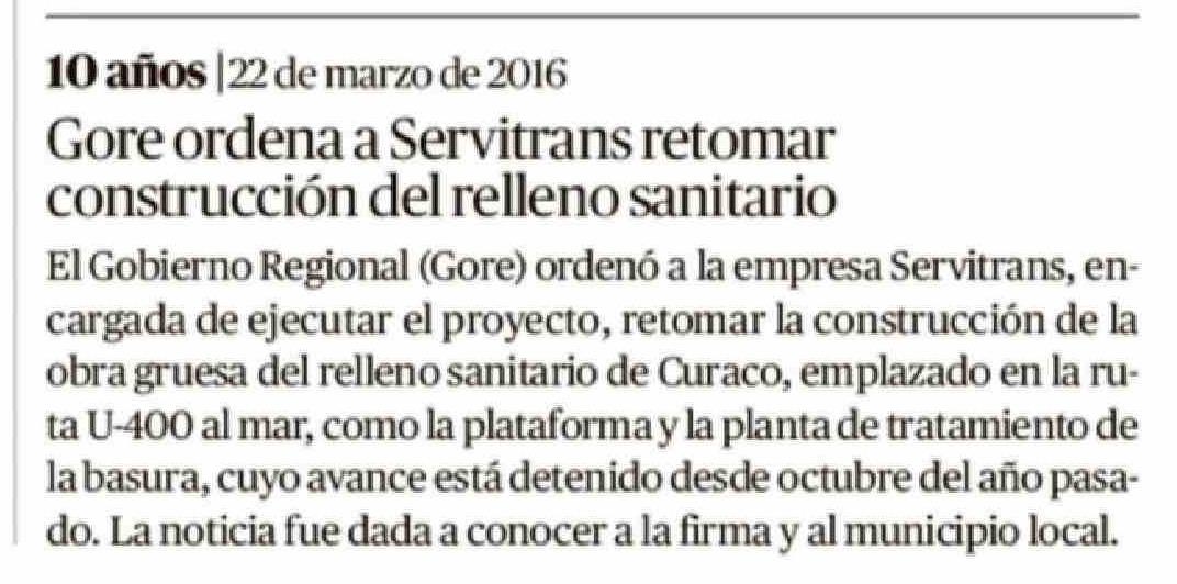 | Título: | 10 años |22 de marzo de 2016 Gore ordena a Servitrans retomar construcción del relleno sanitario El Gobierno Regional (Gore) ordenó a la empresa Servitrans, encargada de ejecutar el proyecto, retomar la construcción de la obra gruesa del relleno sanitario de Curaco, emplazado en la ruta U-400 al mar |