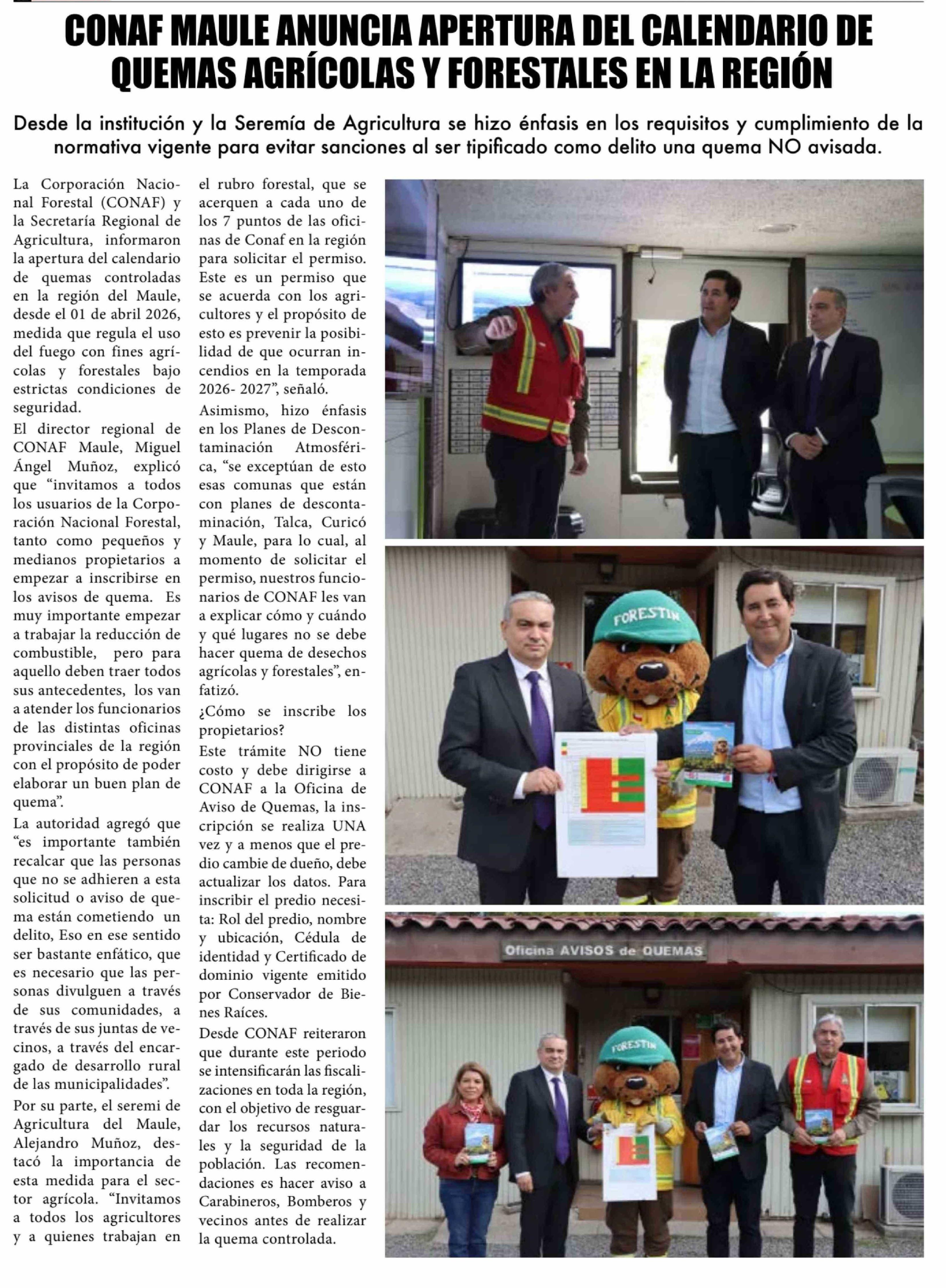 CONAF MAULE ANUNCIA APERTURA DEL CALENDARIO DE QUEMAS AGRÍCOLAS Y FORESTALES EN LA REGIÓN