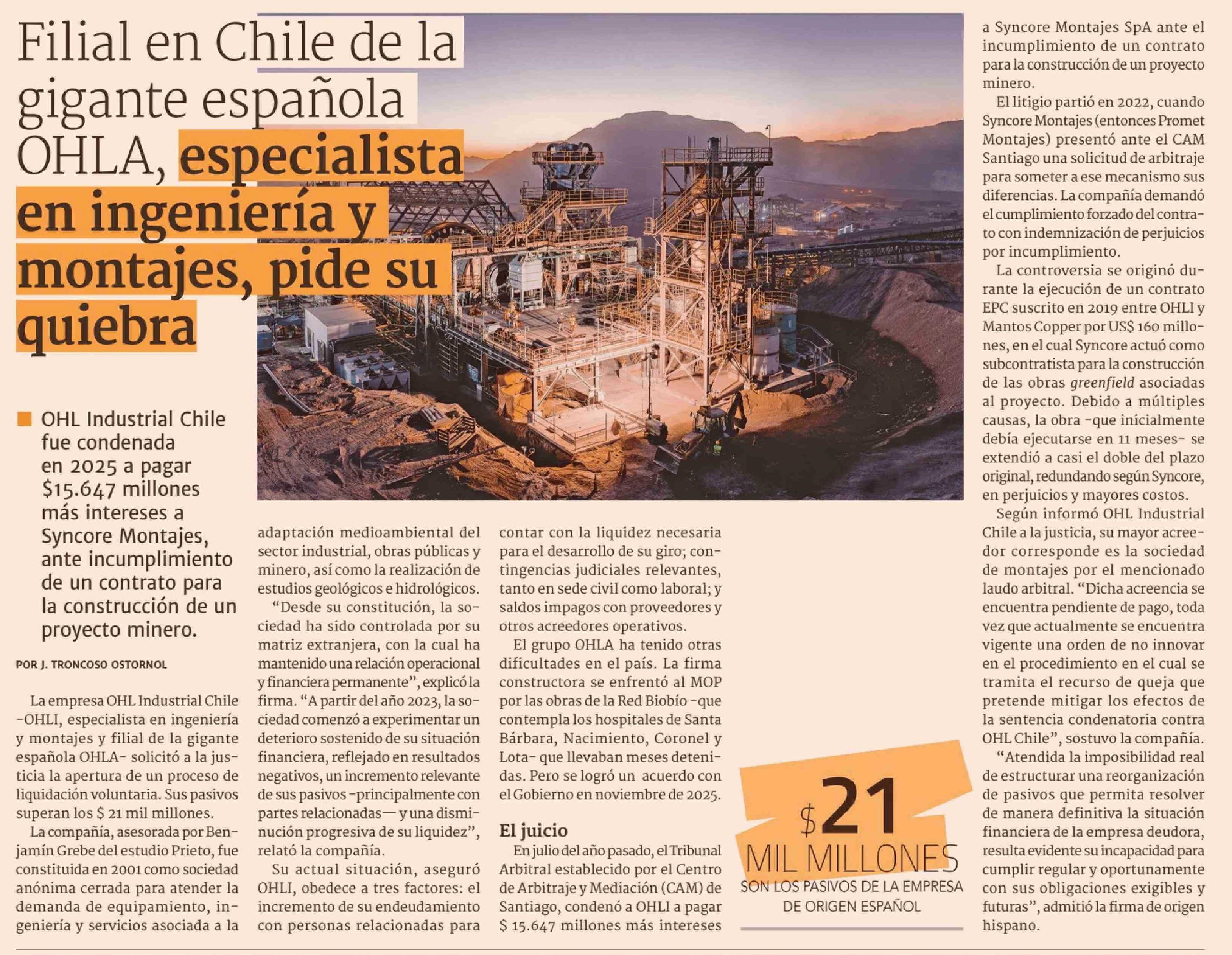 Filial en Chile de la gigante española OHLA, especialista en ingeniería y montajes, pide su quiebra