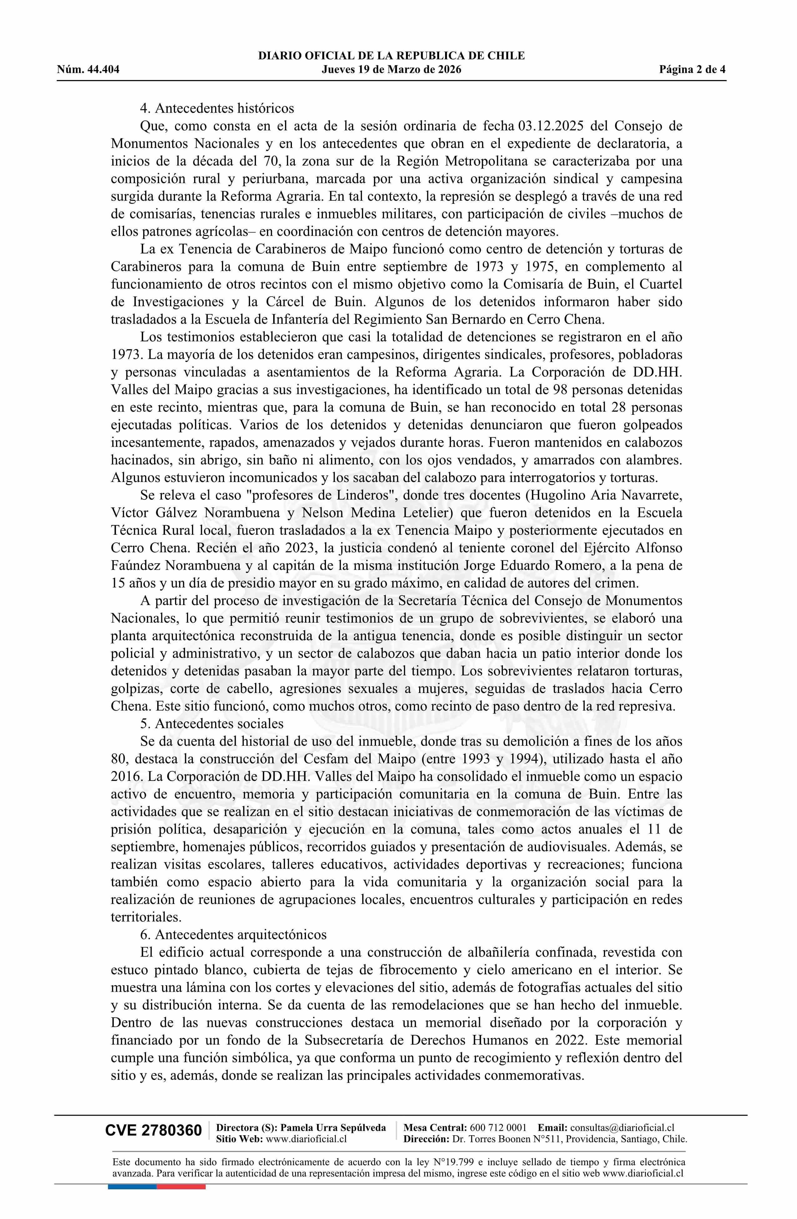 Título: Decreto exento número 38, de 2026.- Declara Monumento Nacional, en la categoría de Monumento Histórico, el Sitio de Memoria Ex Tenencia de Carabineros de Maipo, comuna de Buin, Región Metropolitana de Santiago