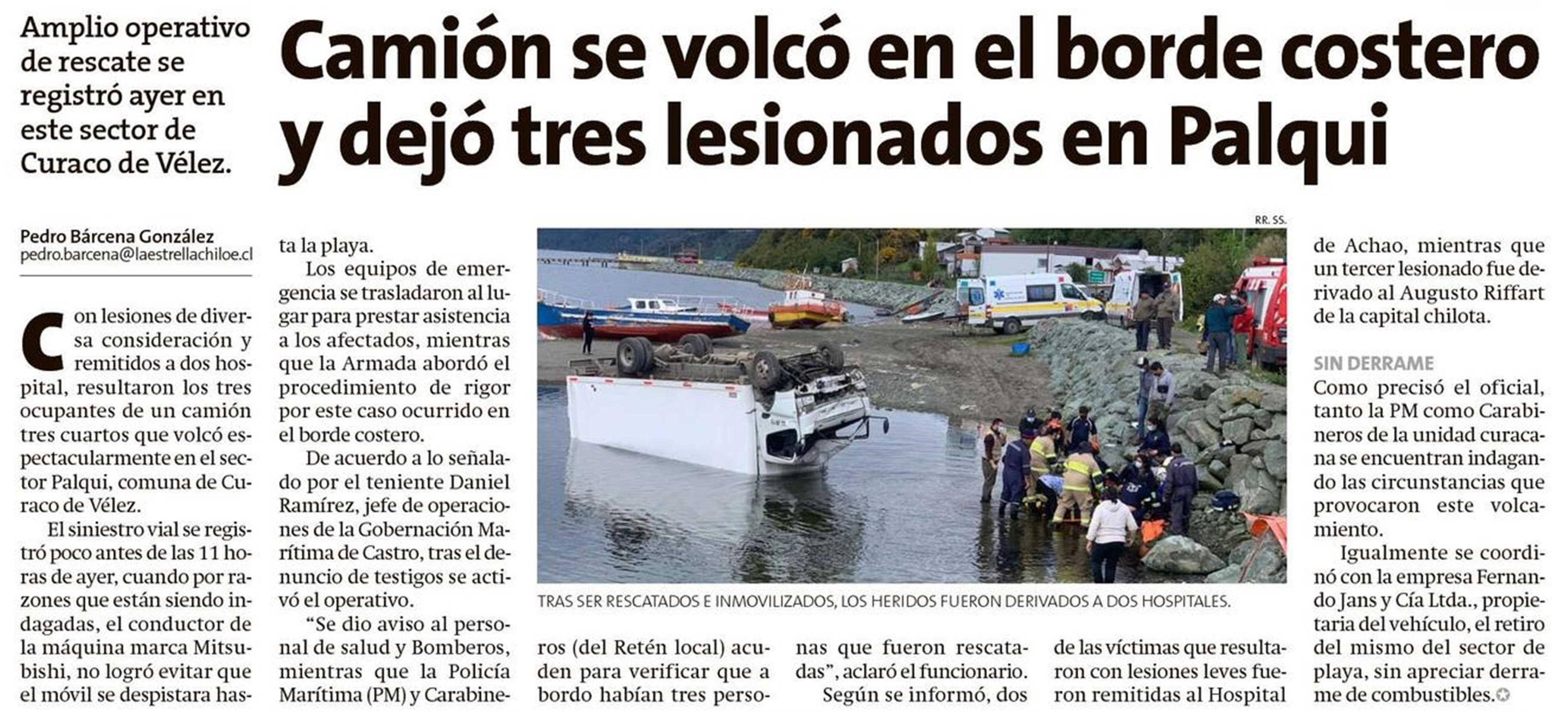 Camión se volcó en el borde costero y dejó tres lesionados en Palqui