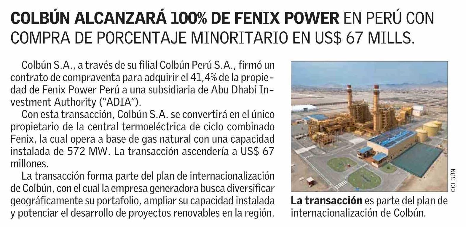 COLBÚN ALCANZARÁ 100% DE FENIX POWER EN PERÚ CON COMPRA DE PORCENTAJE MINORITARIO EN US$ 67 MILLS.