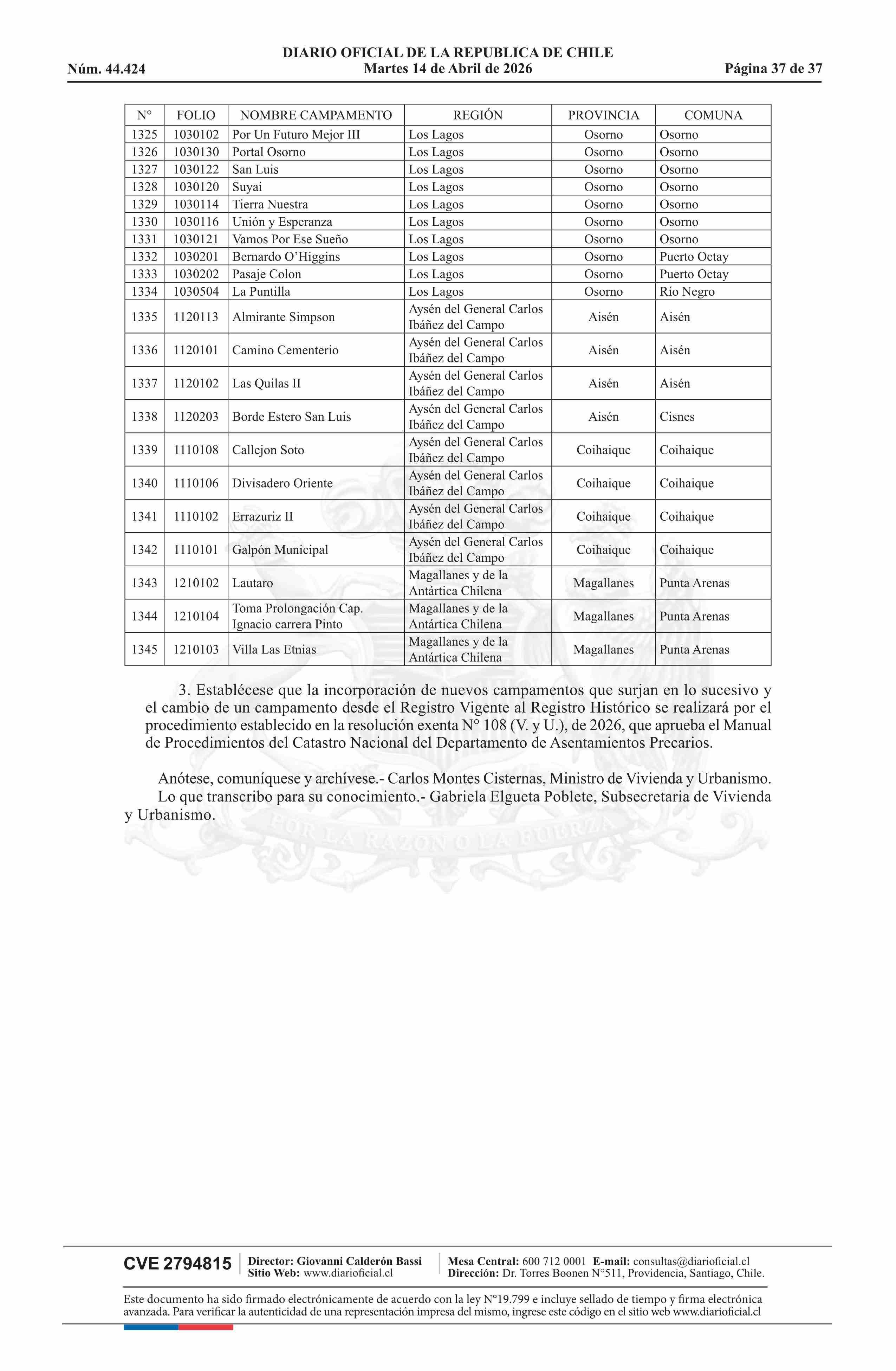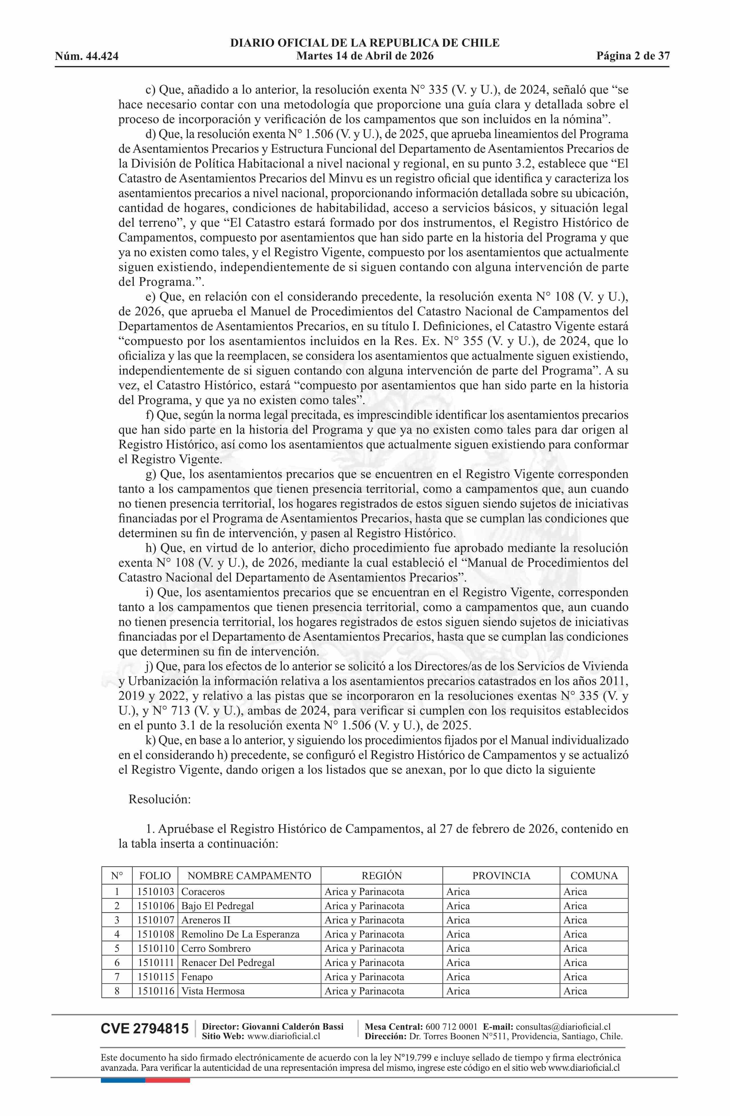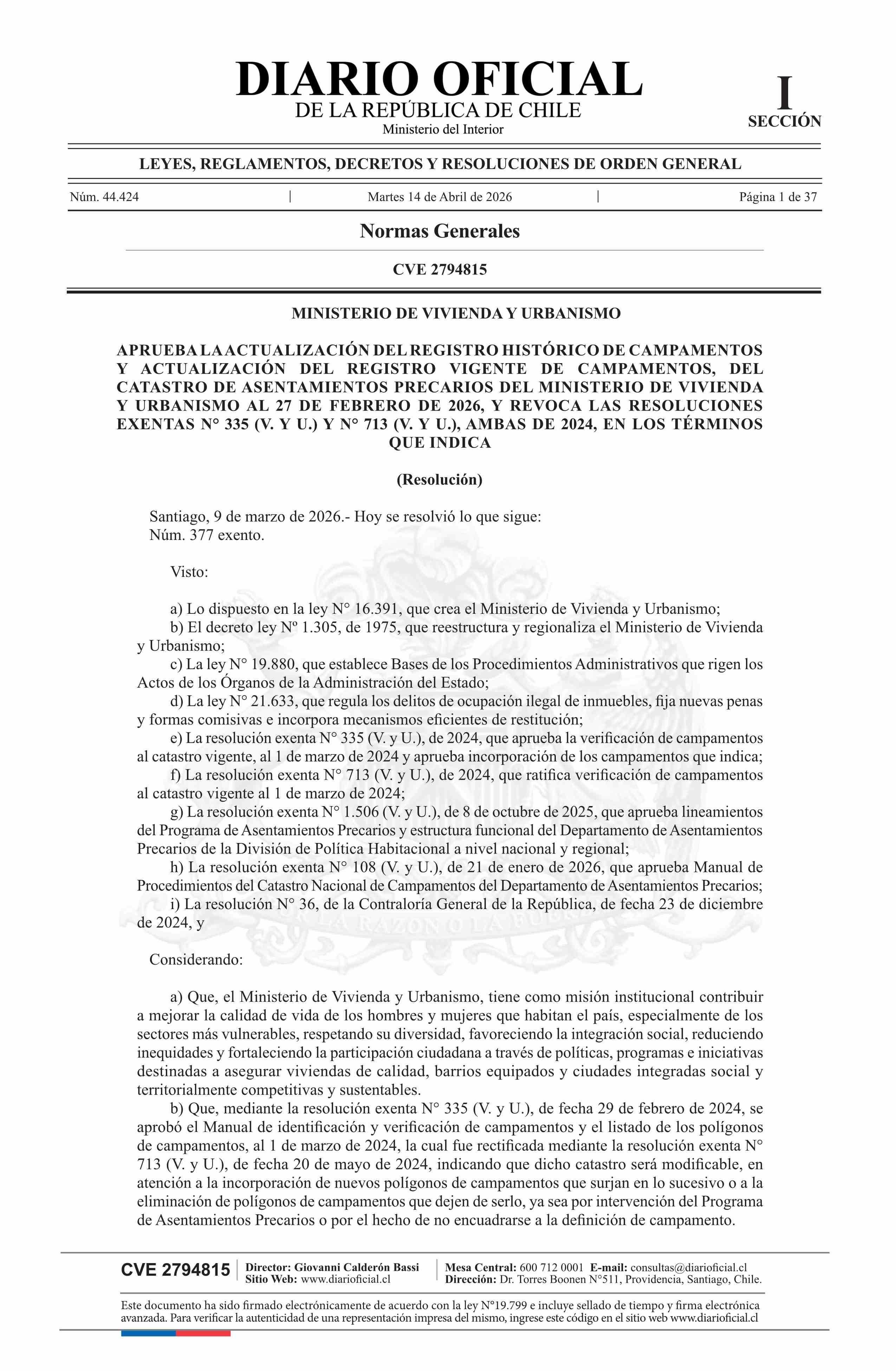 | Título: | Resolución exenta número 377, de 2026.- Aprueba actualización del Registro Histórico de Campamentos y actualización del Registro Vigente de Campamentos, del Catastro de Asentamientos Precarios al 27 de febrero de 2026, y revoca las resoluciones N°s. 335 y 713 exentas, de 2024 |