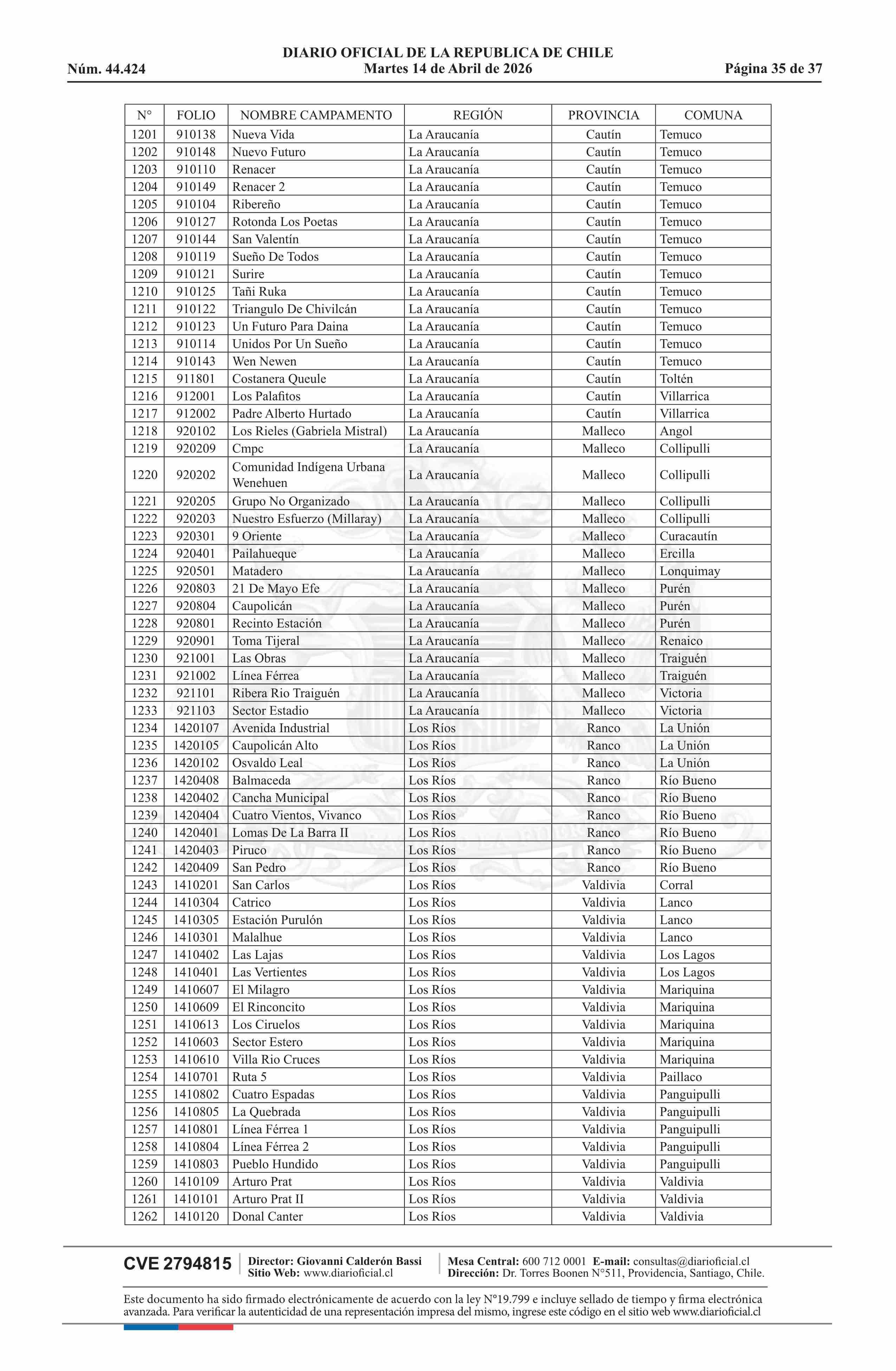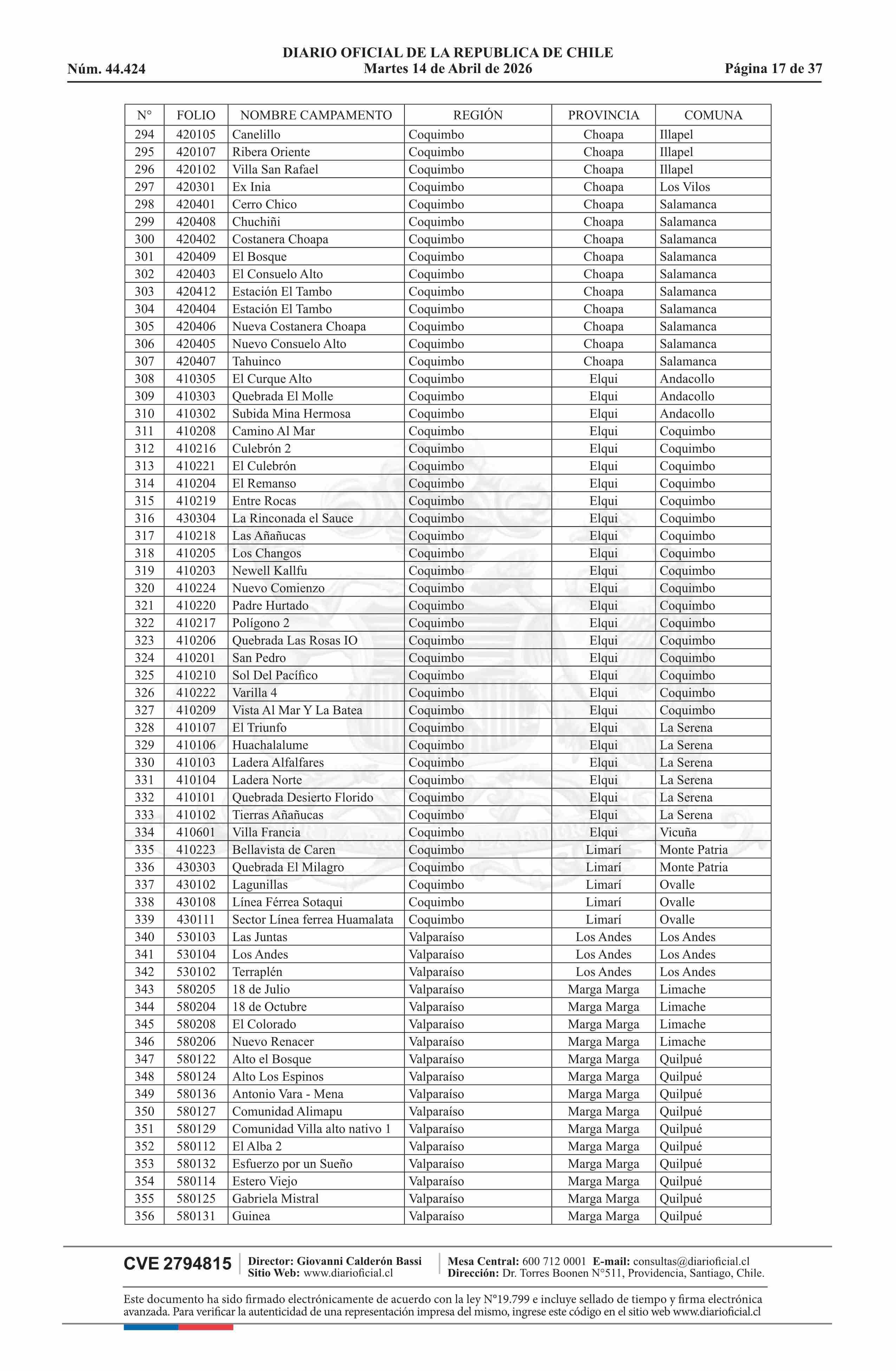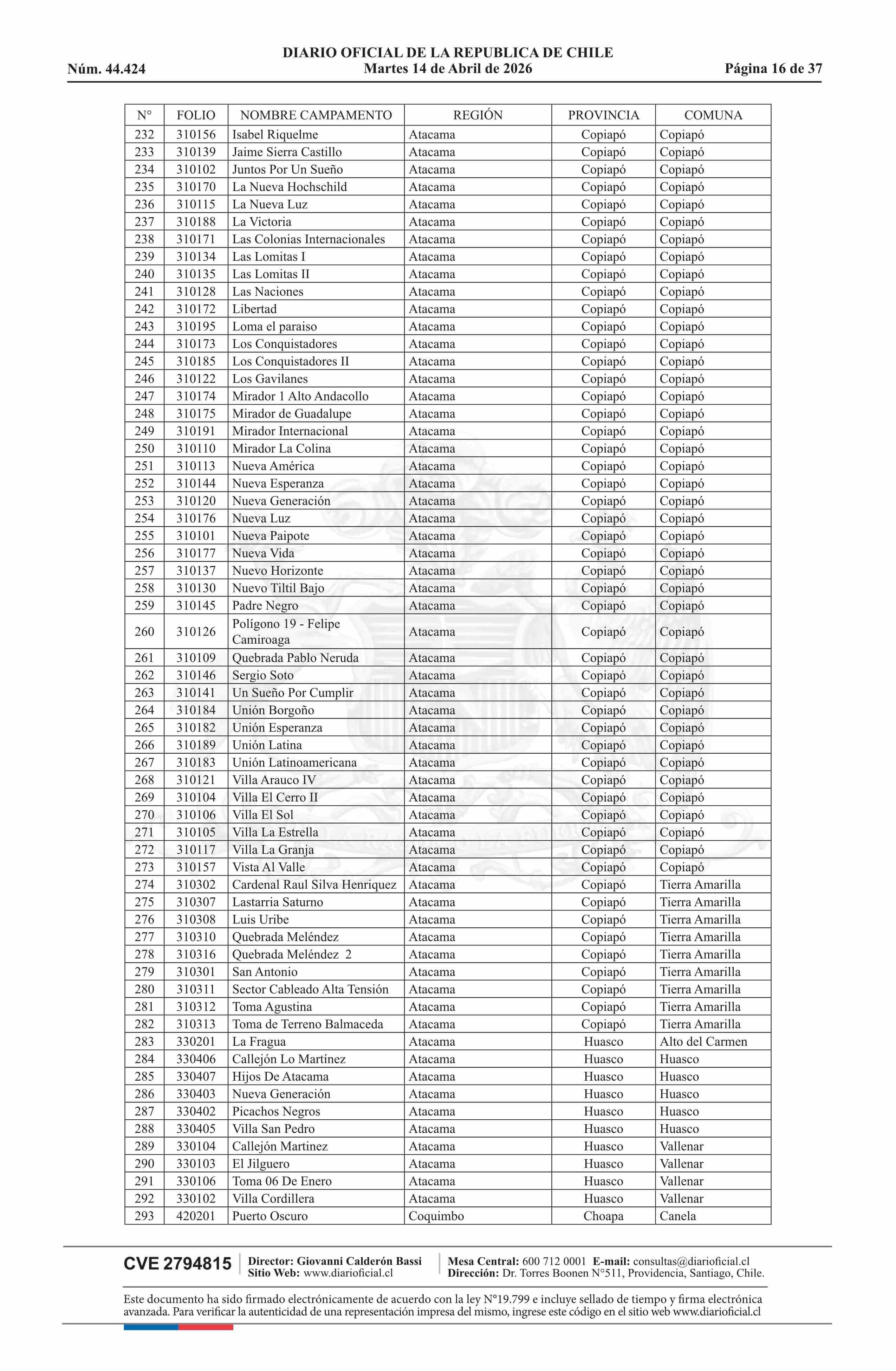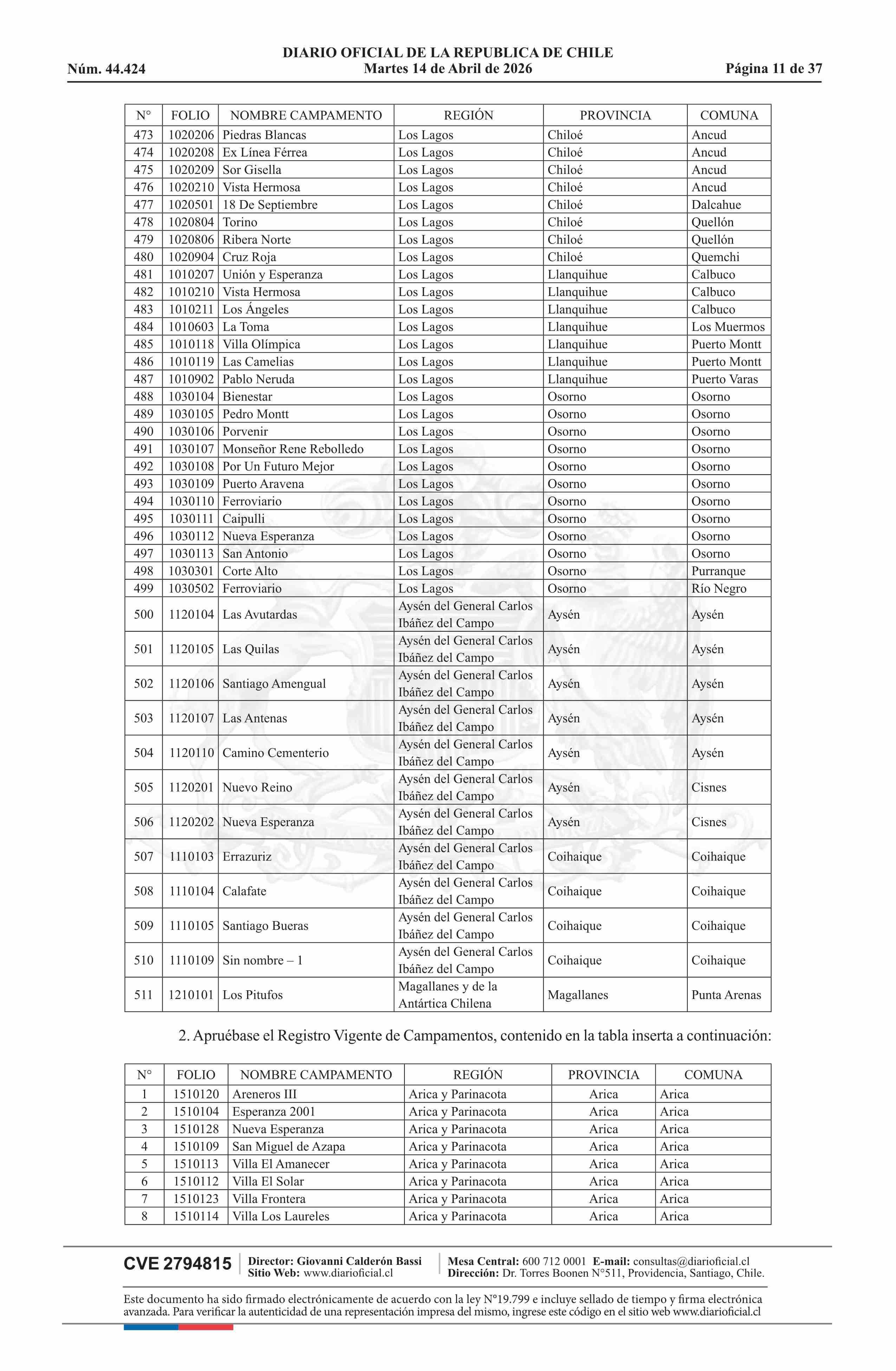 | Título: | Resolución exenta número 377, de 2026.- Aprueba actualización del Registro Histórico de Campamentos y actualización del Registro Vigente de Campamentos, del Catastro de Asentamientos Precarios al 27 de febrero de 2026, y revoca las resoluciones N°s. 335 y 713 exentas, de 2024 |