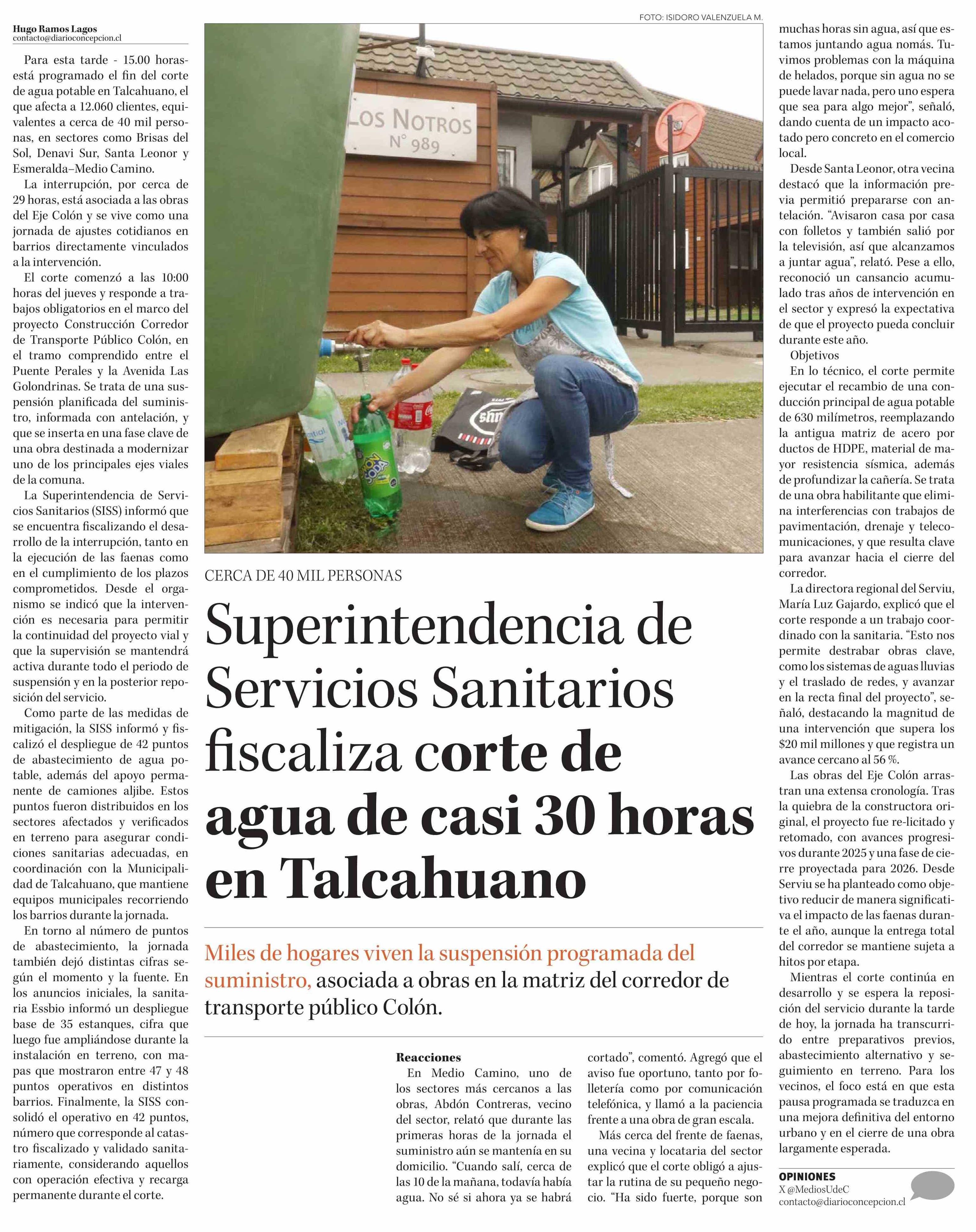 Superintendencia de Servicios Sanitarios fiscaliza corte de agua de casi 30 horas en Talcahuano