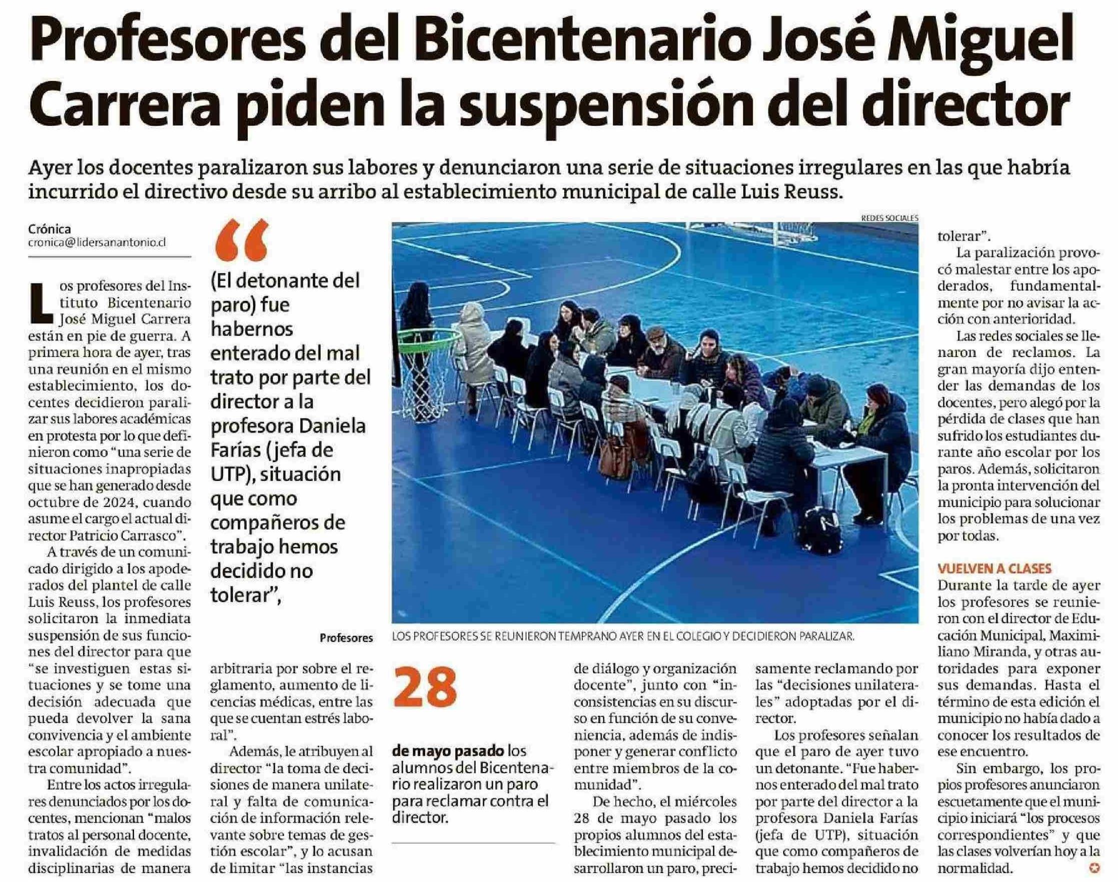 Profesores del Bicentenario José Miguel Carrera piden la suspensión del director