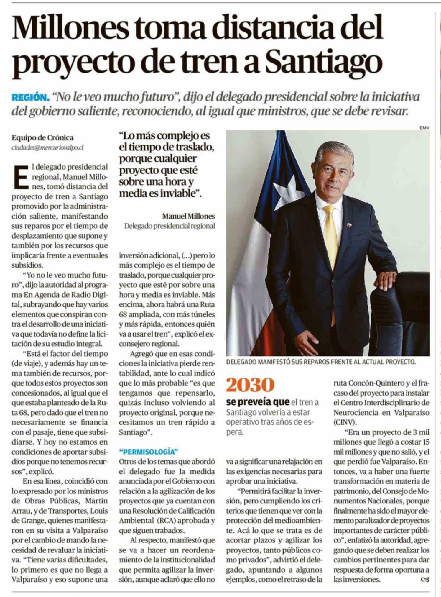 Millones toma distancia del proyecto de tren a Santiago