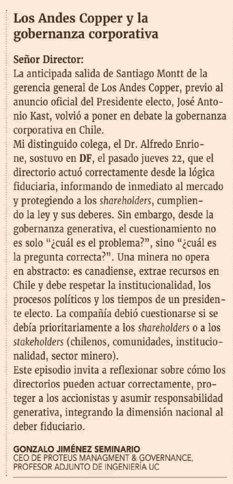 Cartas: Los Andes Copper y la gobernanza corporativa