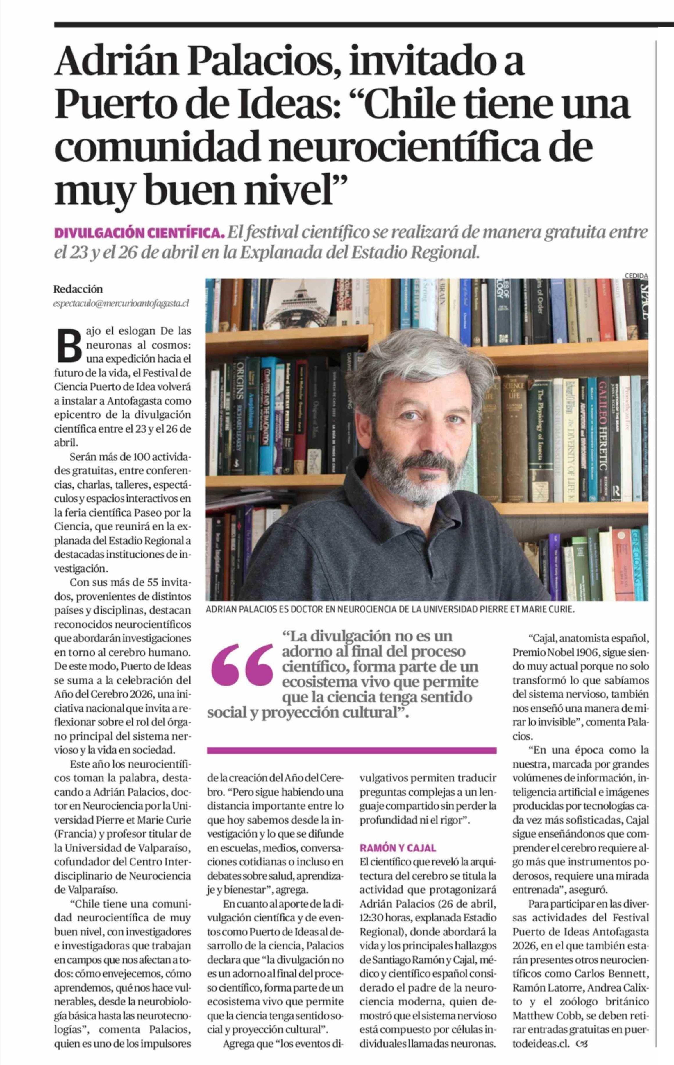 Adrián Palacios, invitado a Puerto de Ideas: “Chile tiene una comunidad neurocientífica de muy buen nivel”