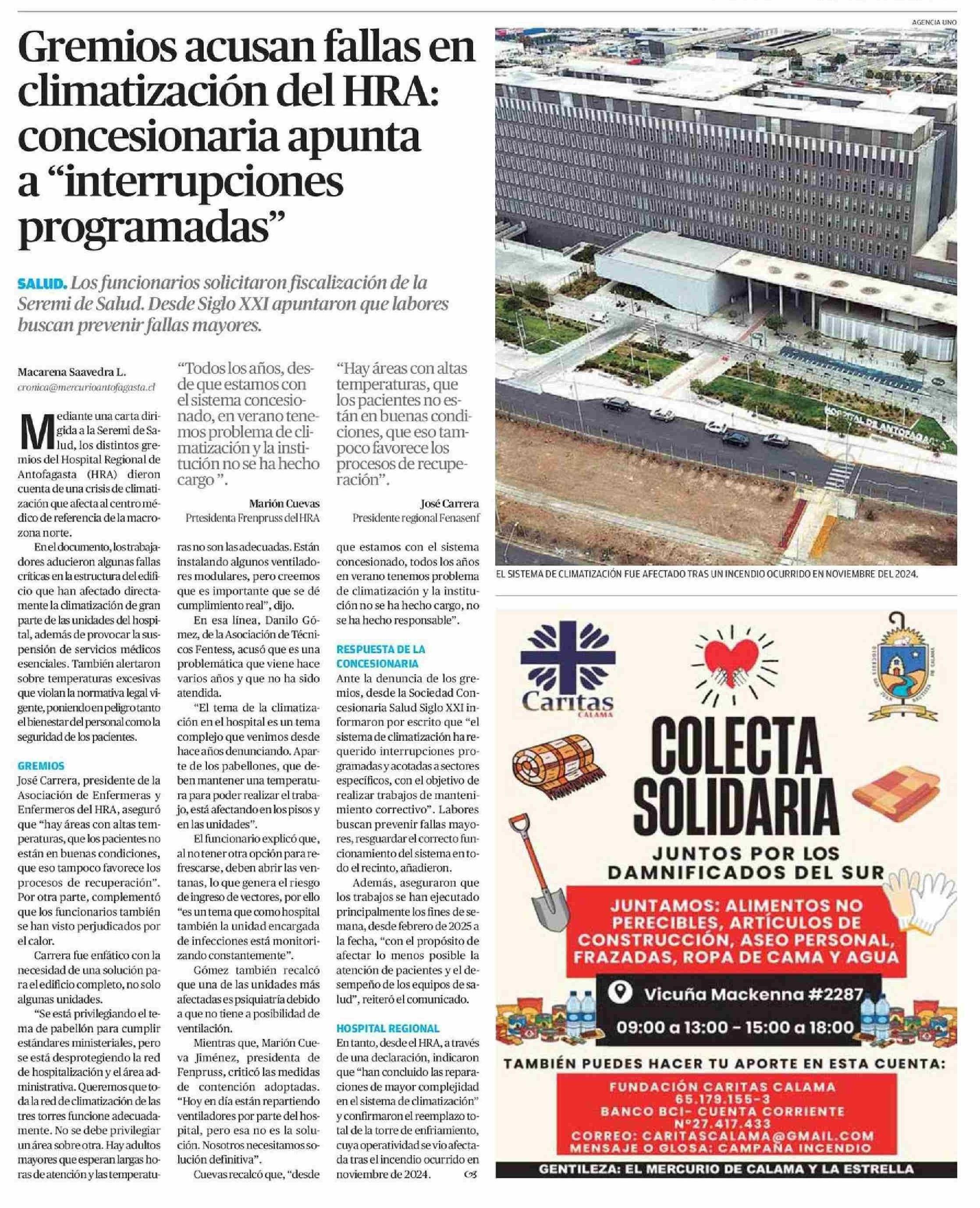 Título: Gremios acusan fallas en climatización del HRA: concesionaria apunta a "interrupciones programadas"