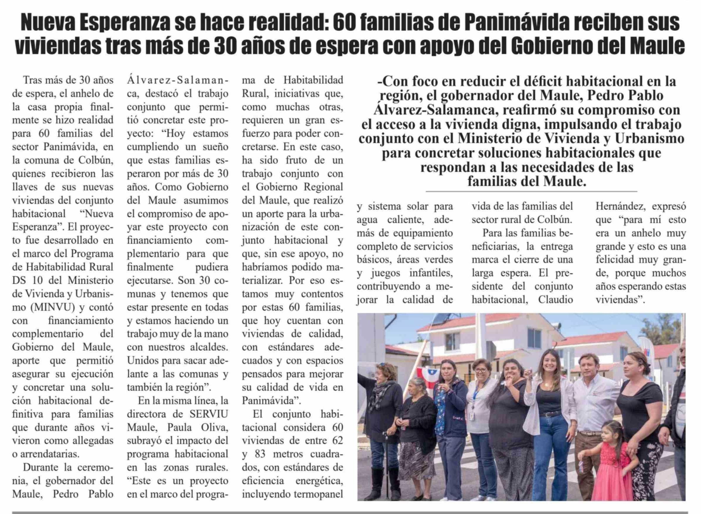 Nueva Esperanza se hace realidad: 60 familias de Panimávida reciben sus viviendas tras más de 30 años de espera con apoyo del Gobierno del Maule