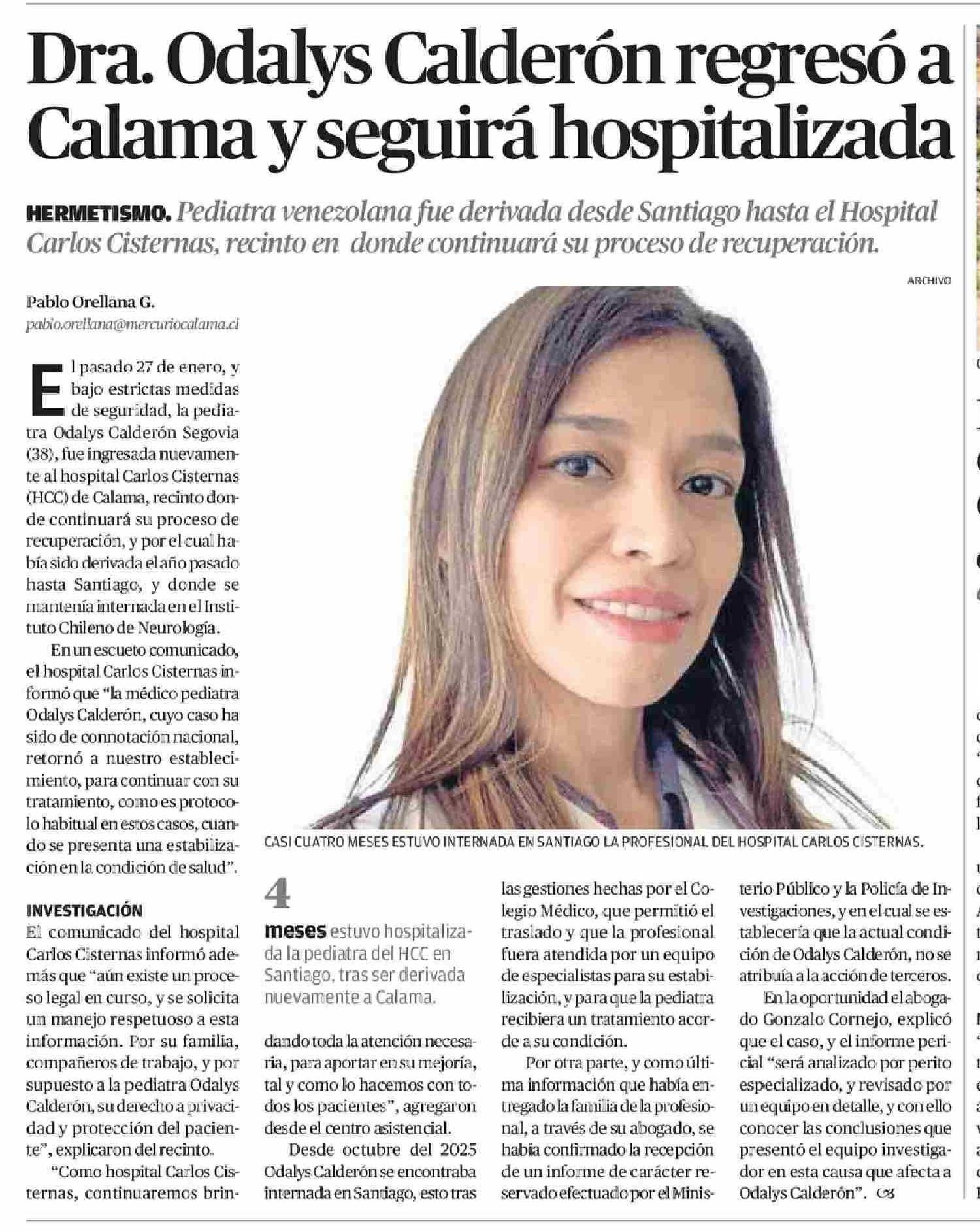 Dra. Odalys Calderón regresó a Calama y seguirá hospitalizada