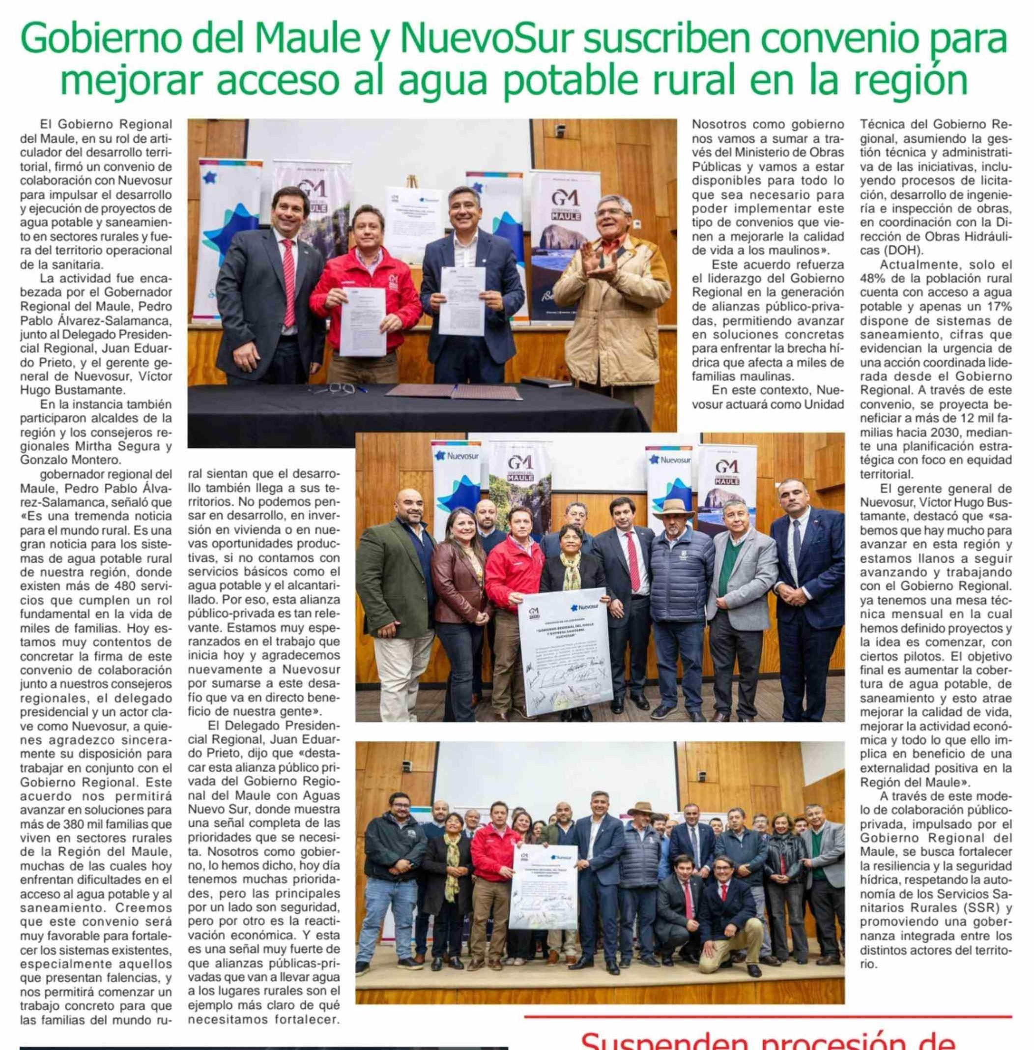 Gobierno del Maule y NuevoSur suscriben convenio para mejorar acceso al agua potable rural en la región