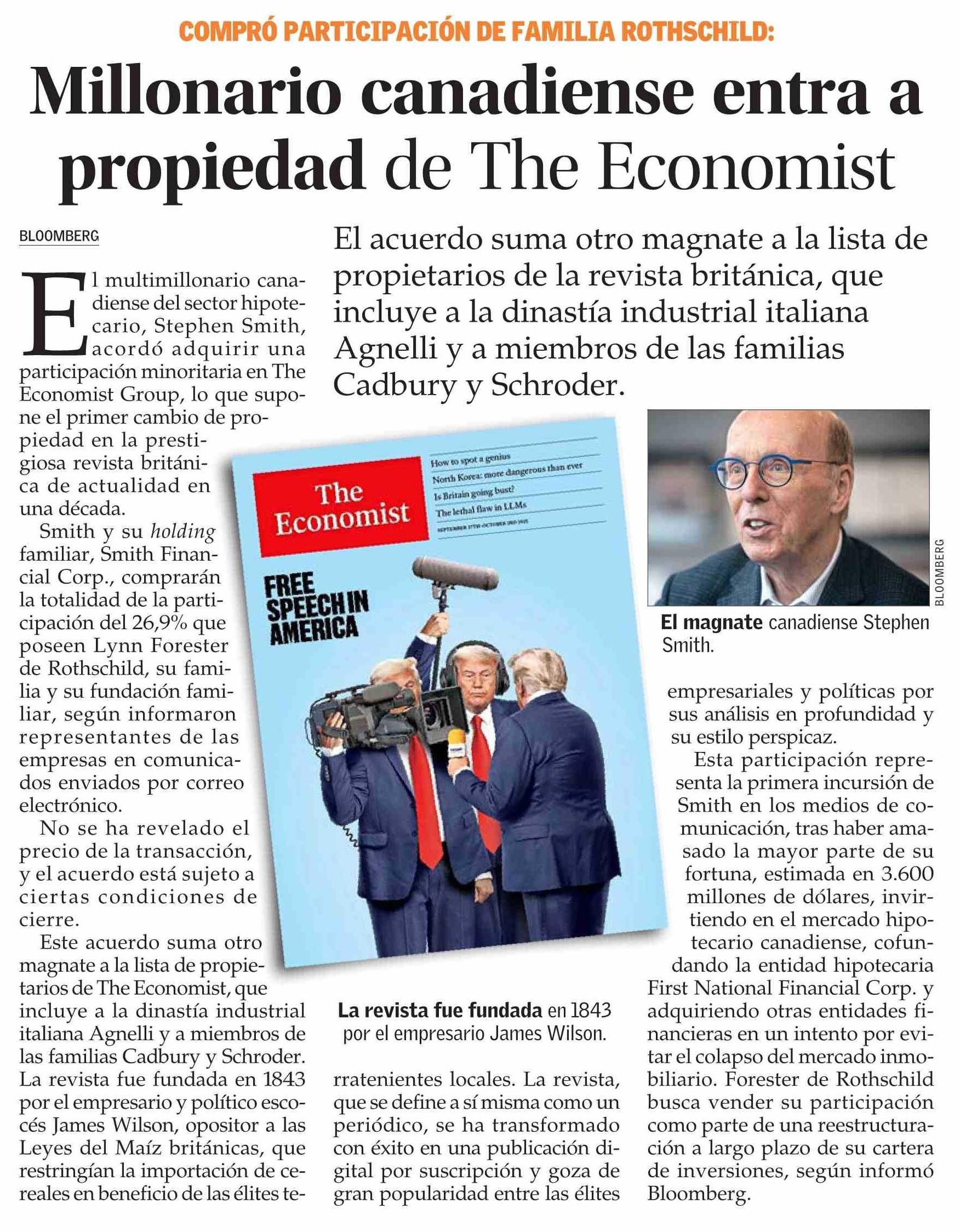 Millonario canadiense entra a propiedad de The Economist