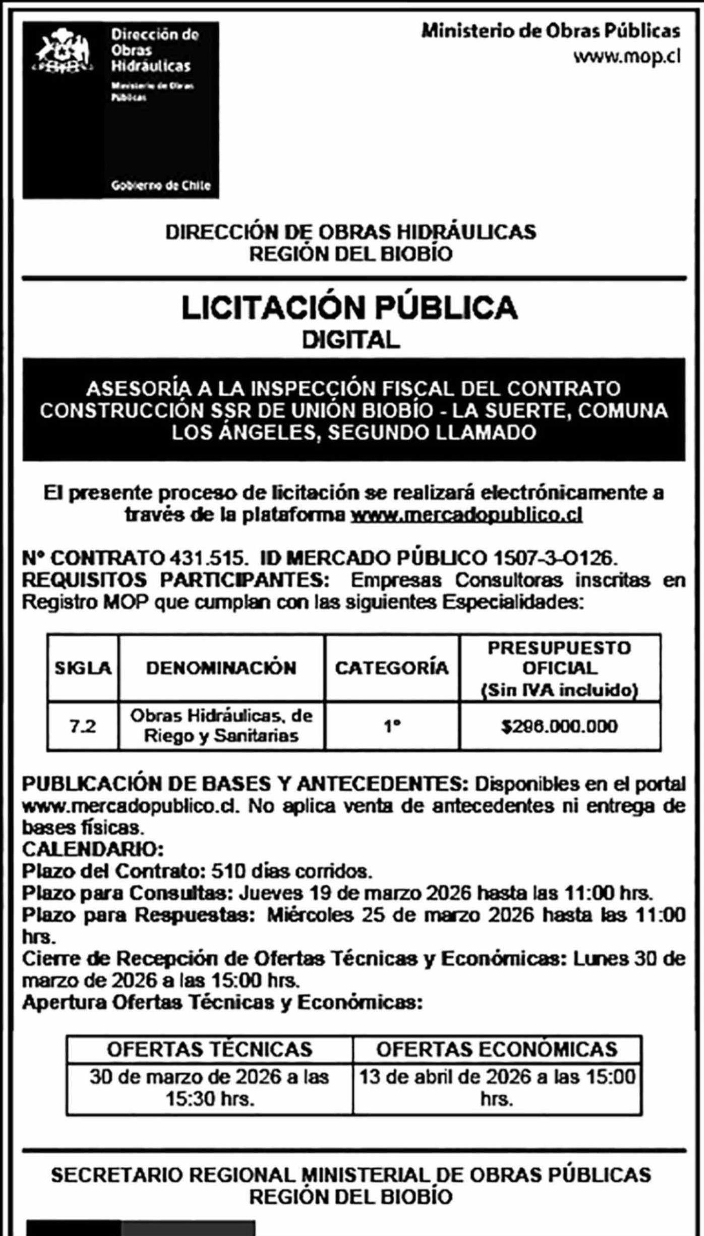 Aviso Licitaciones: MINISTERIO DE OBRAS PÚBLICAS