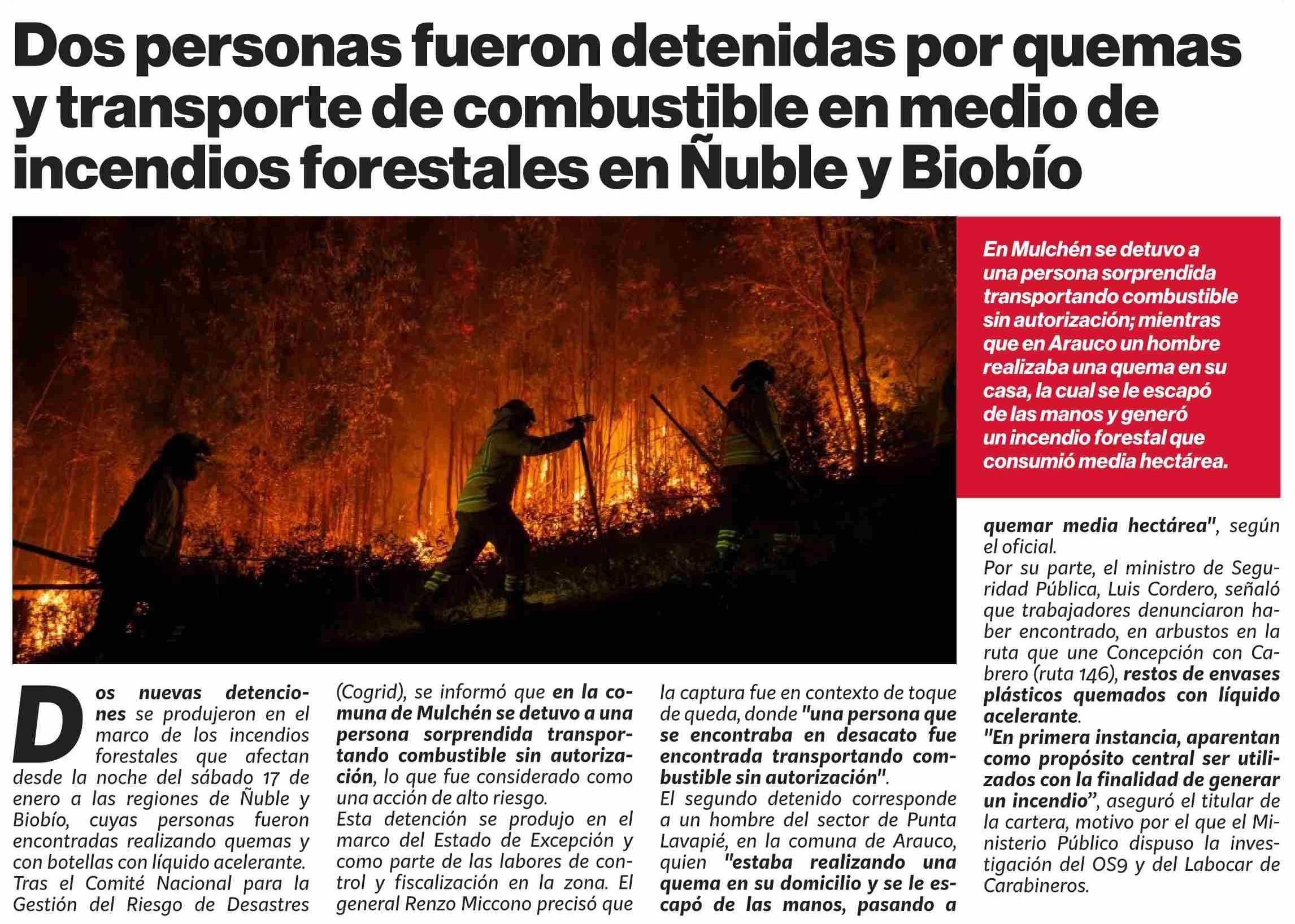 Dos personas fueron detenidas por quemas y transporte de combustible en medio de incendios forestales en Nuble y Biobío