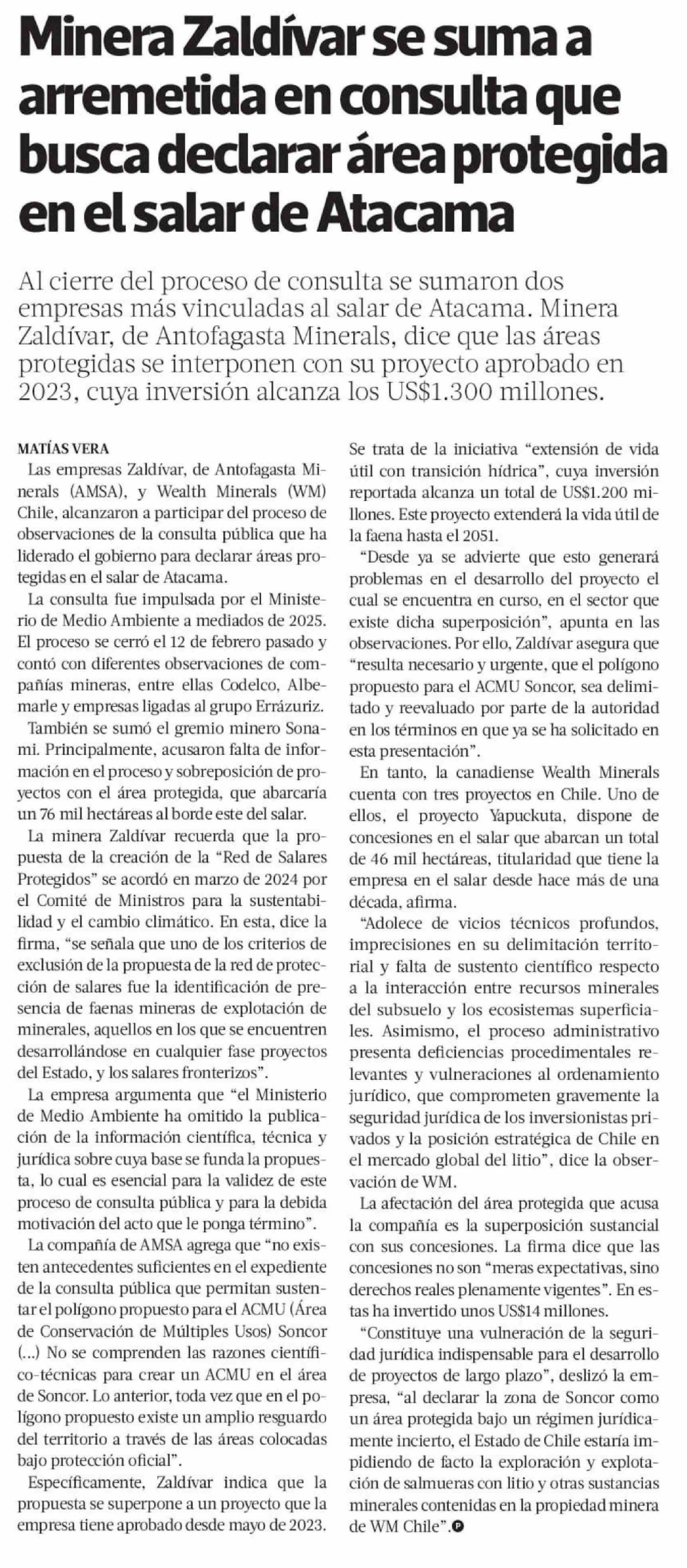 Minera Zaldívar se suma a arremetida en consulta que busca declarar área protegida en el salar de Atacama