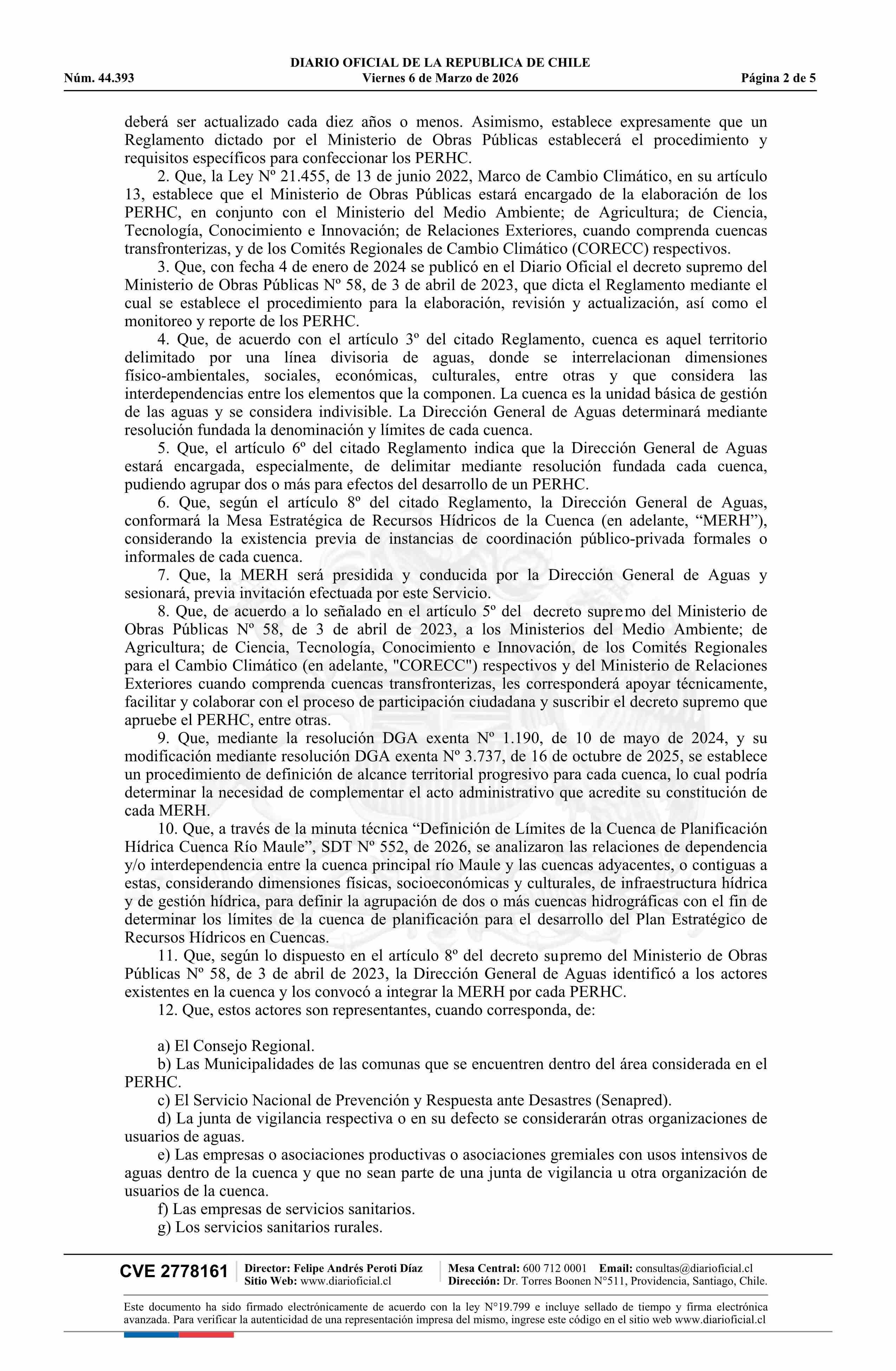 | Título: | Resolución exenta número 430, de 2026.- Delimita y denomina cuenca de planificación para el desarrollo del Plan Estratégico de Recursos Hídricos en la Cuenca del Río Maule y Adyacentes; constituye mesa estratégica de recursos hídricos; identifica convocados y asistencia a primera sesión; y designa d |
