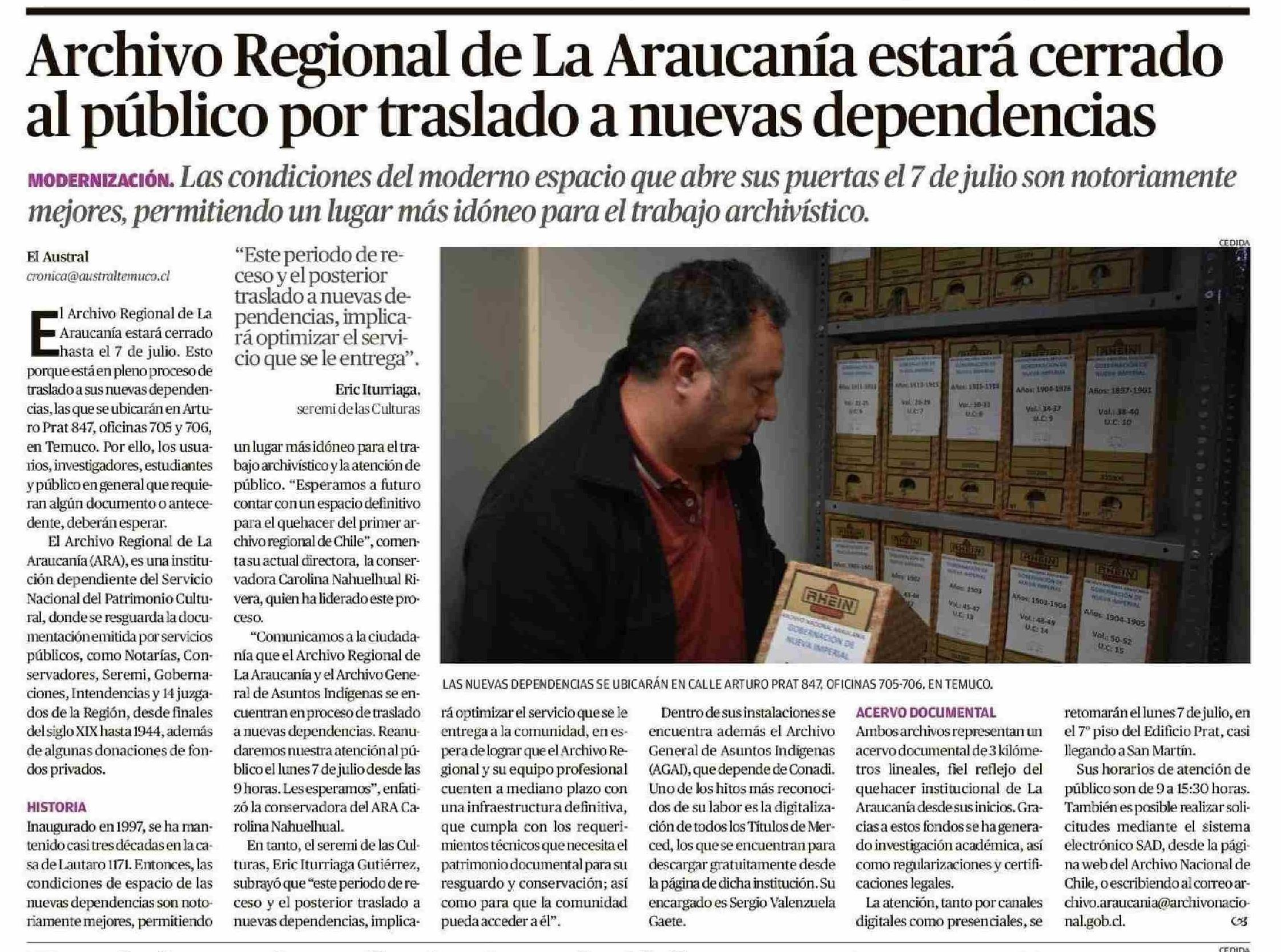 Archivo Regional de La Araucanía estará cerrado al público por traslado a nuevas dependencias