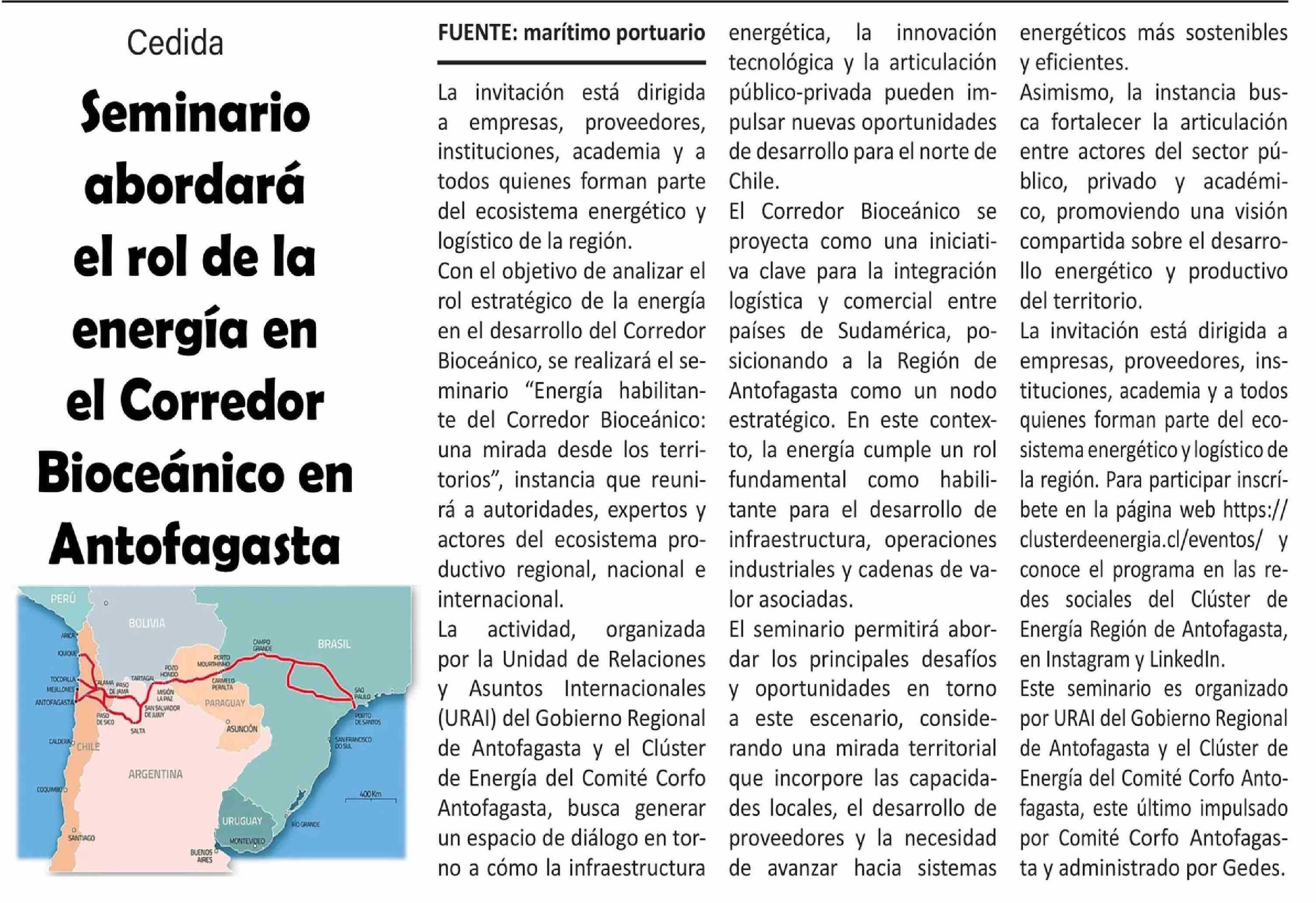 Seminario abordará el rol de la energía en el Corredor Bioceánico en Antofagasta
