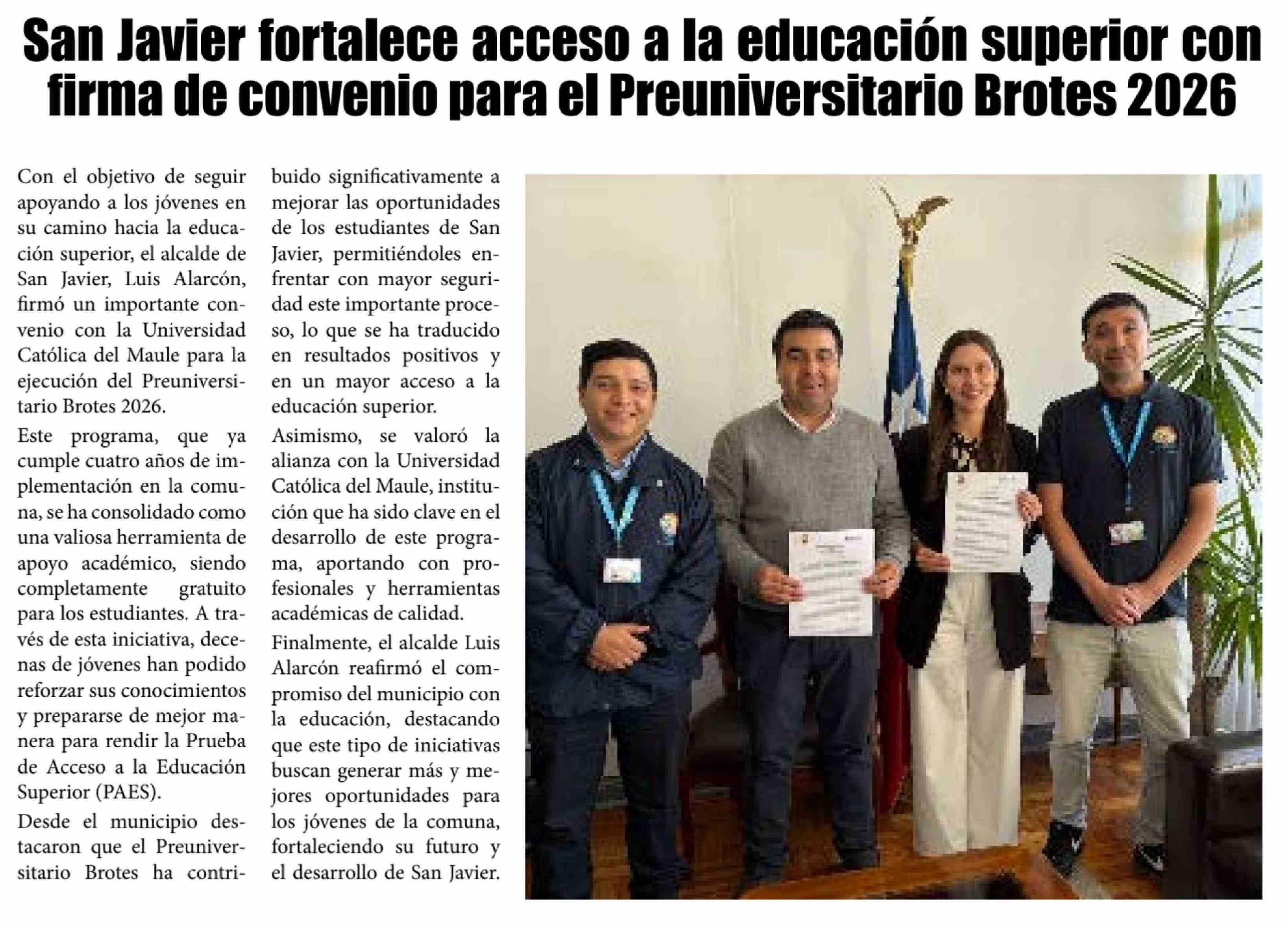 Título: San Javier fortalece acceso a la educación superior con firma de convenio para el Preuniversitario Brotes 2026