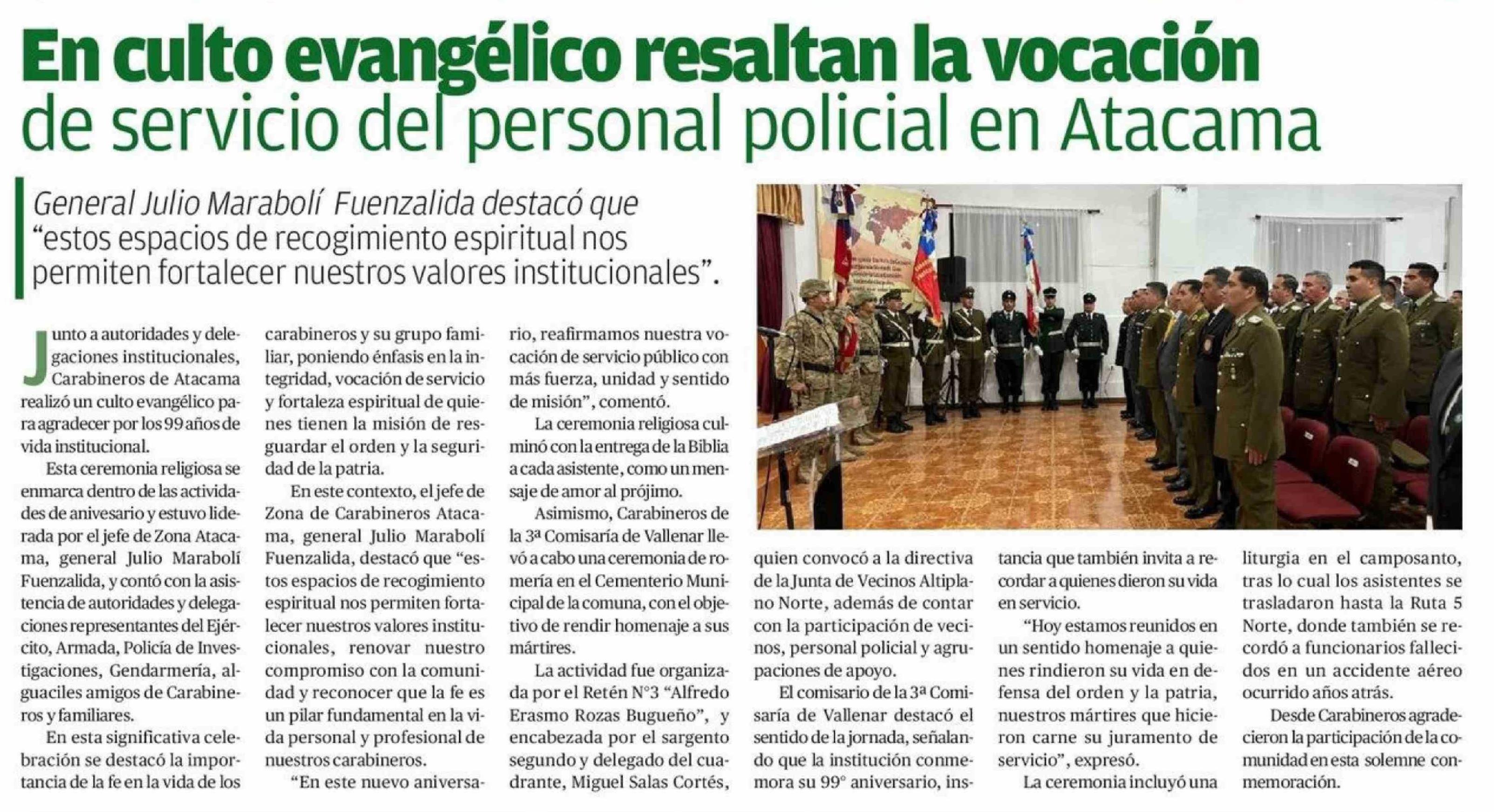 En culto evangélico resaltan la vocación de servicio del personal policial en Atacama