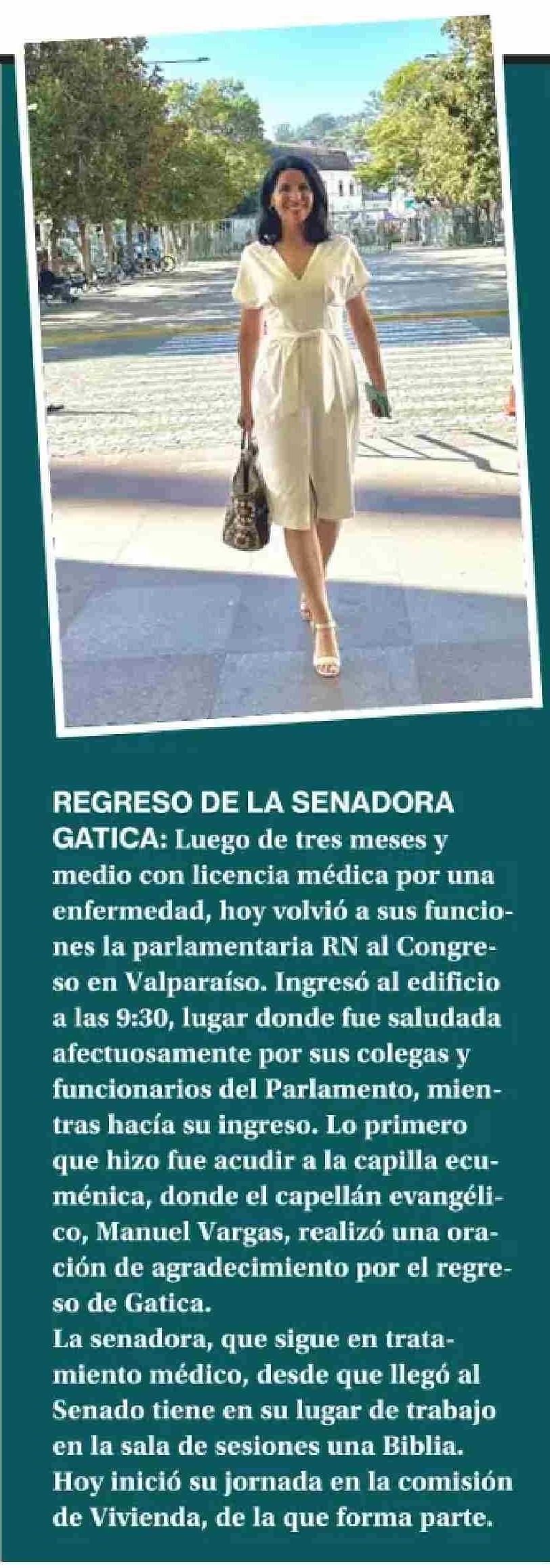 | Título: | REGRESO DE LA SENADORA GATICA: Luego de tres meses y medio con licencia médica por una enfermedad, hoy volvió a sus funciones la parlamentaria RN al Congreso en Valparaíso. Ingresó al edificio a las 9:30, lugar donde fue saludada afectuosamente por sus colegas y funcionarios del Parlamento, mientras |
