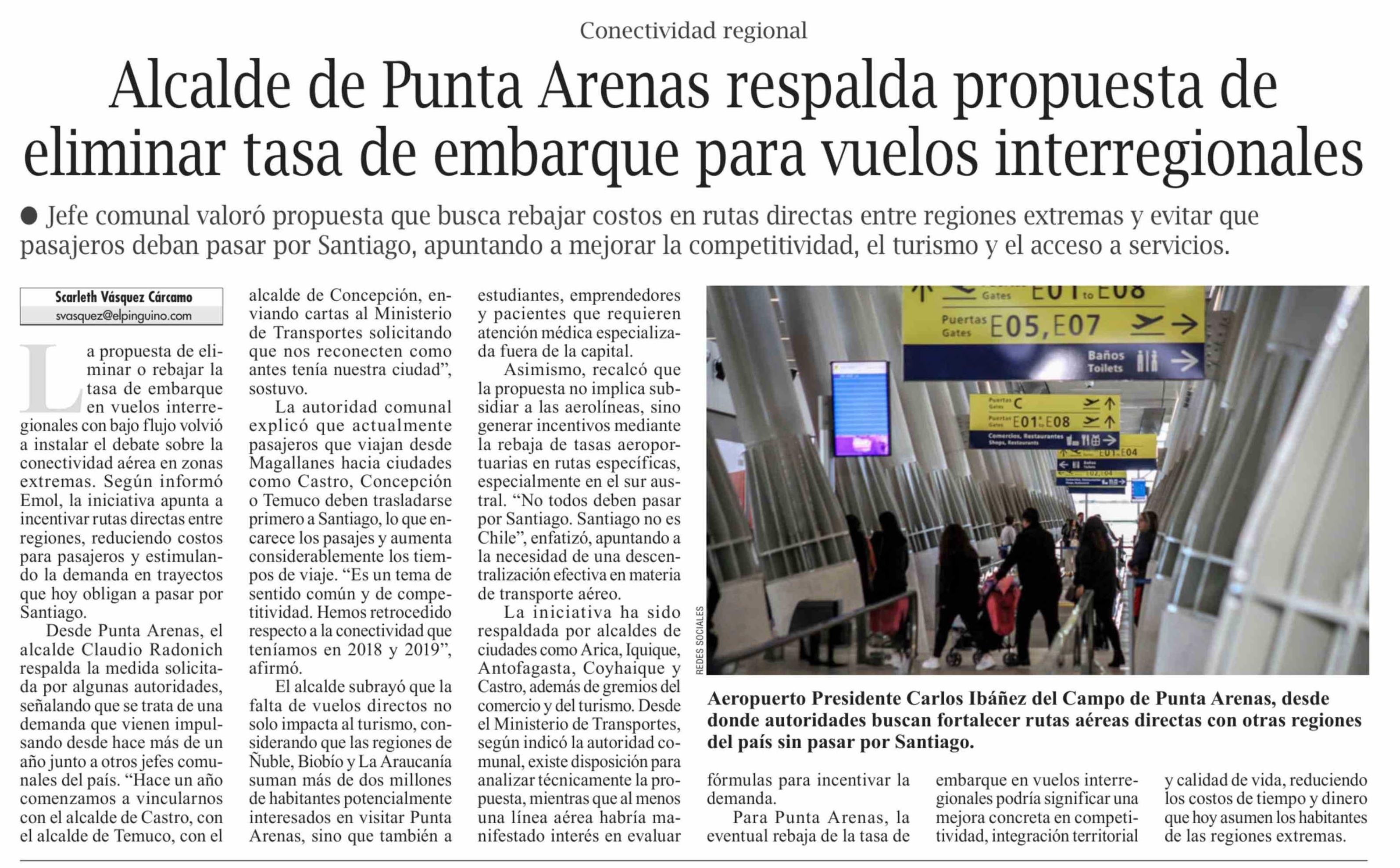 Alcalde de Punta Arenas respalda propuesta de eliminar tasa de embarque para vuelos interregionales