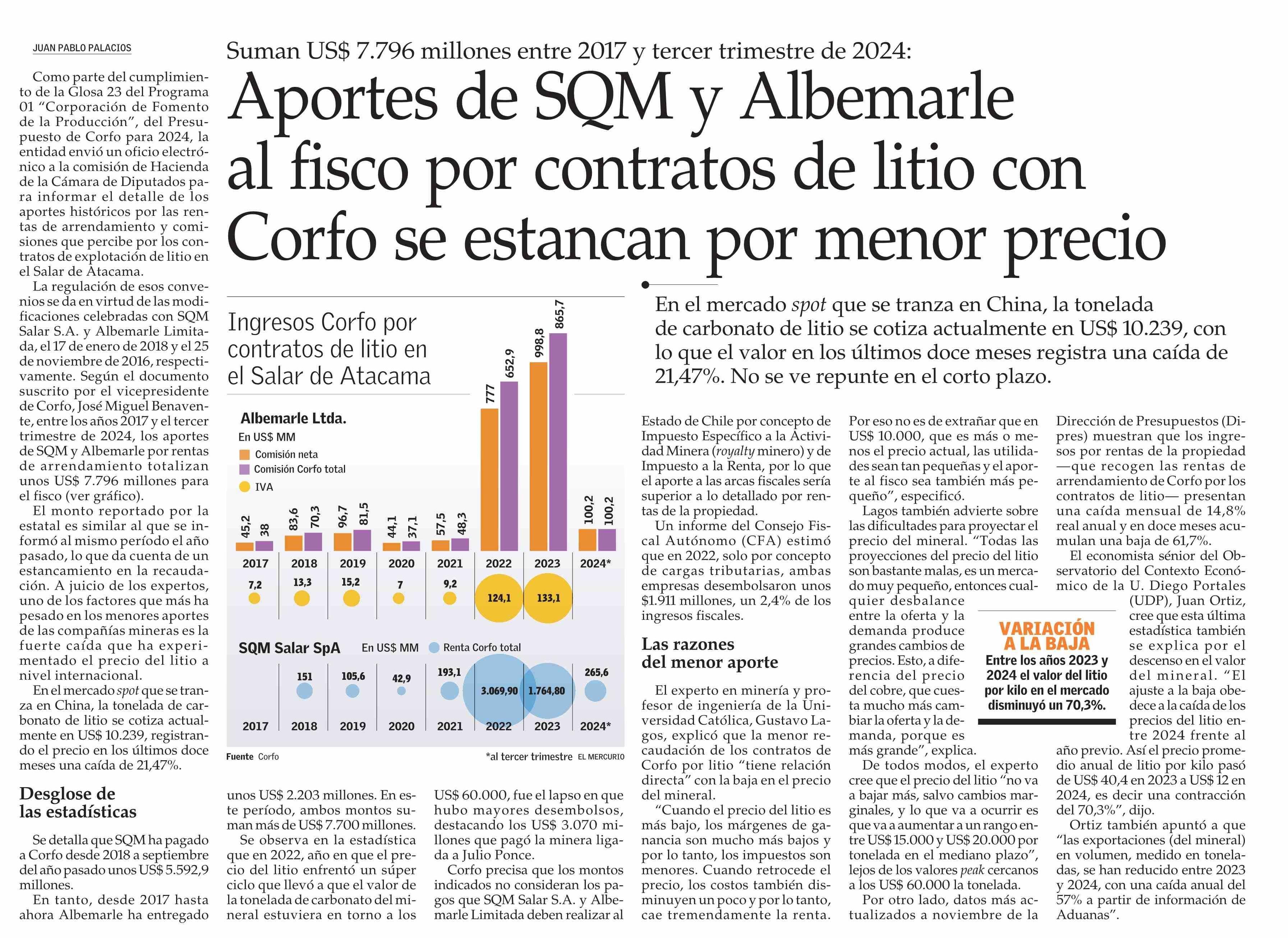 Aportes de SQM y Albemarle al fisco por contratos de litio con Corfo se estancan por menor precio