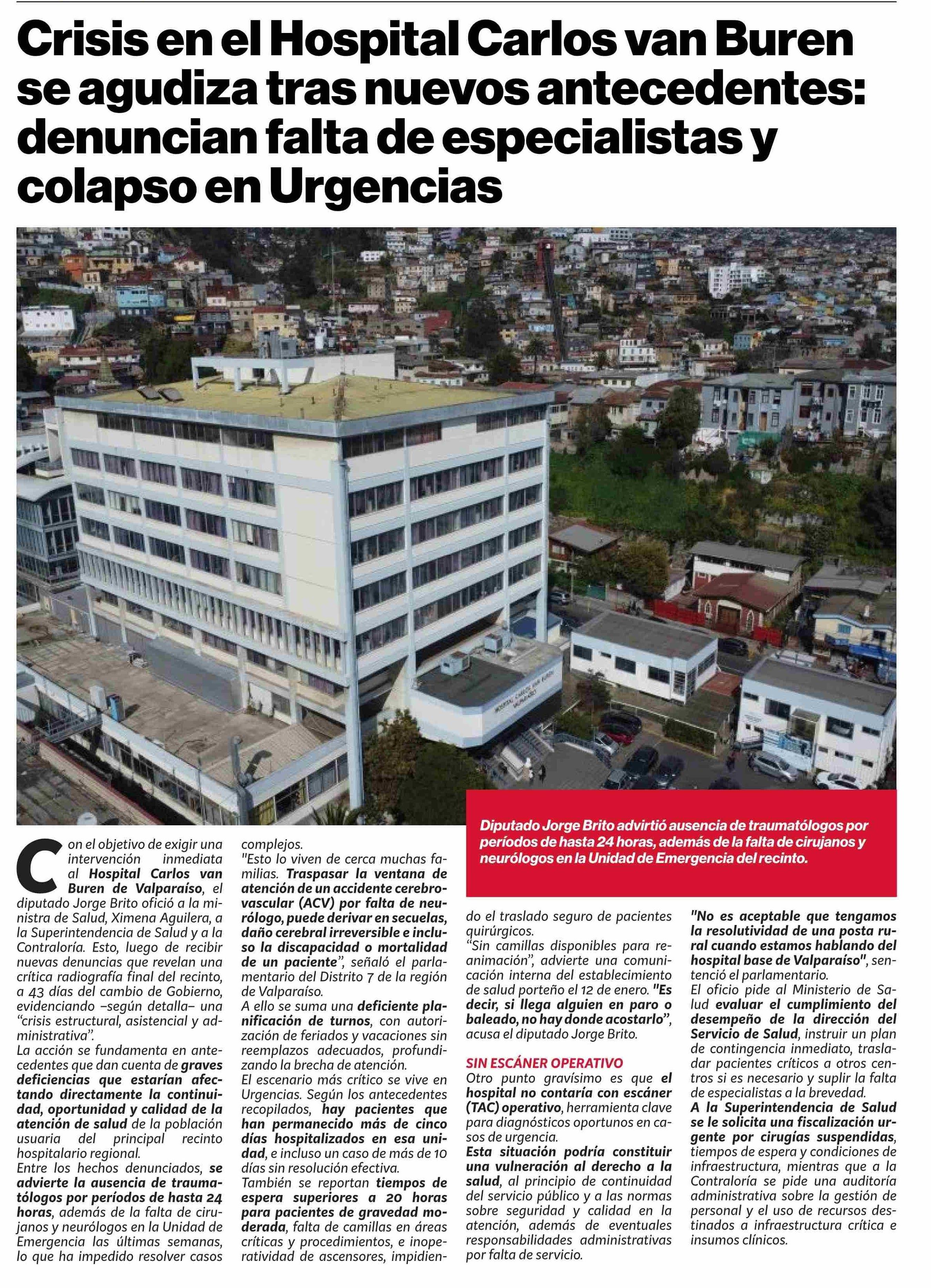 Crisis en el Hospital Carlos van Buren se agudiza tras nuevos antecedentes: denuncian falta de especialistas y colapso en Urgencias