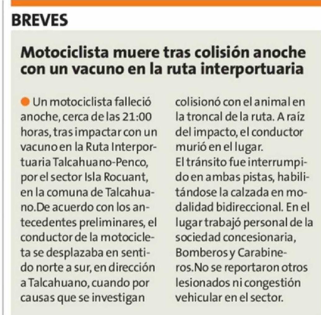 Motociclista muere tras colisión anoche con un vacuno en la ruta interportuaria