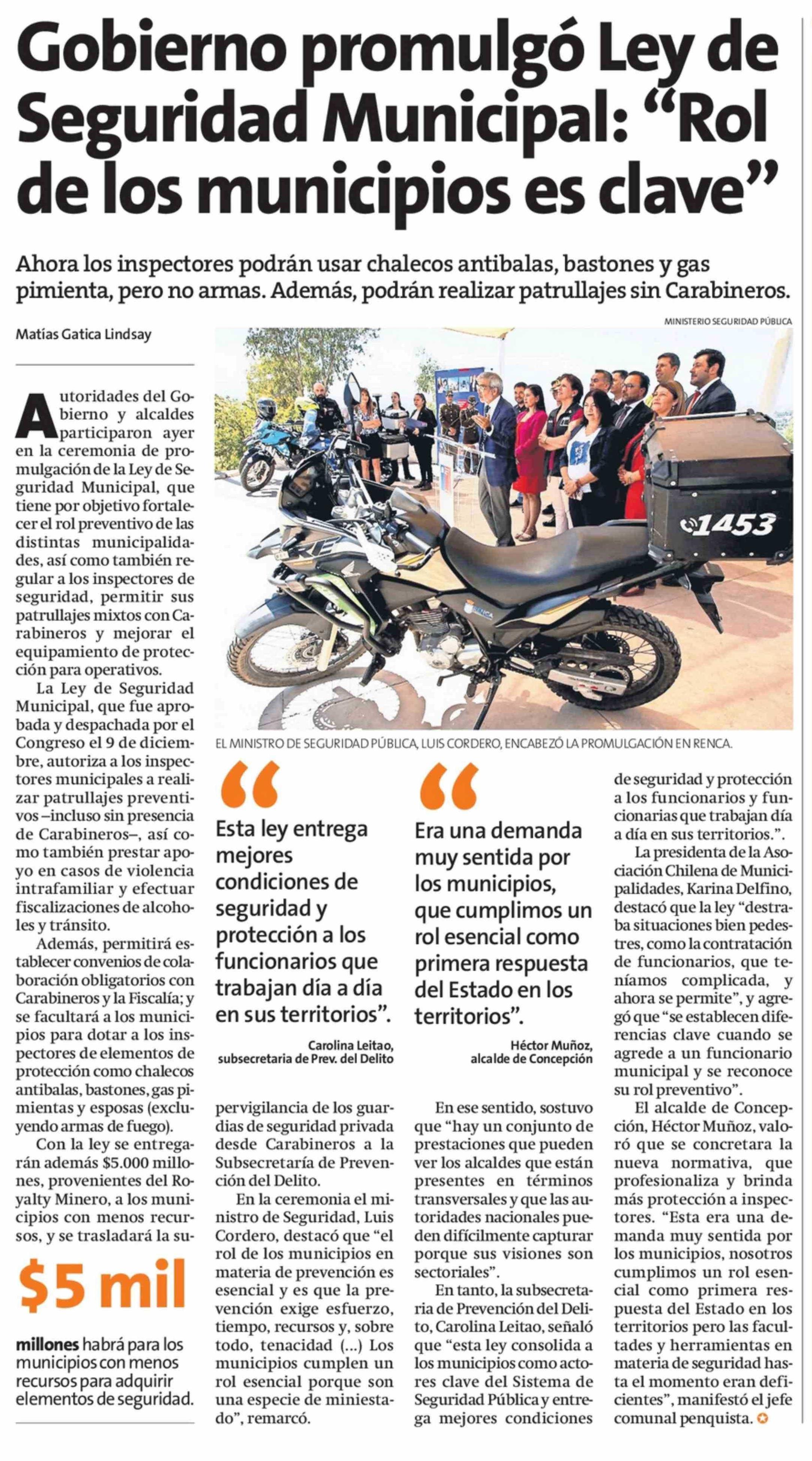 Gobierno promulgó Ley de Seguridad Municipal: "Rol de los municipios es clave"